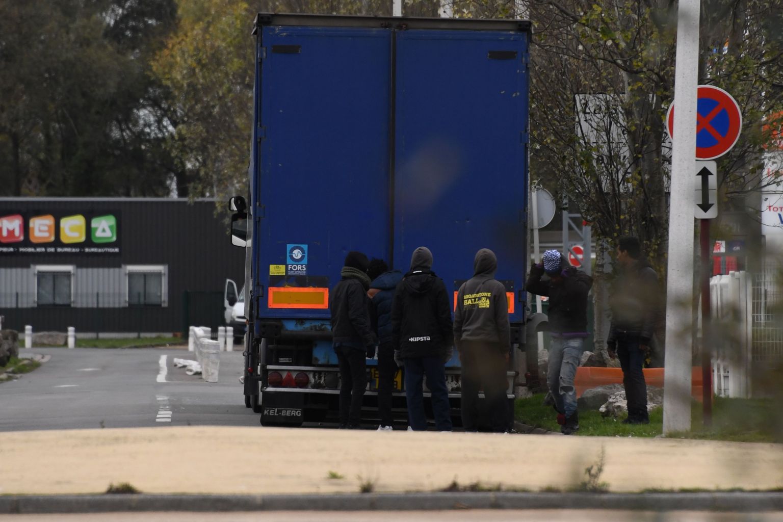 Migrants open the back doors of a lorry in Calais on Nov 14, 2017 in an attempt to reach England.
