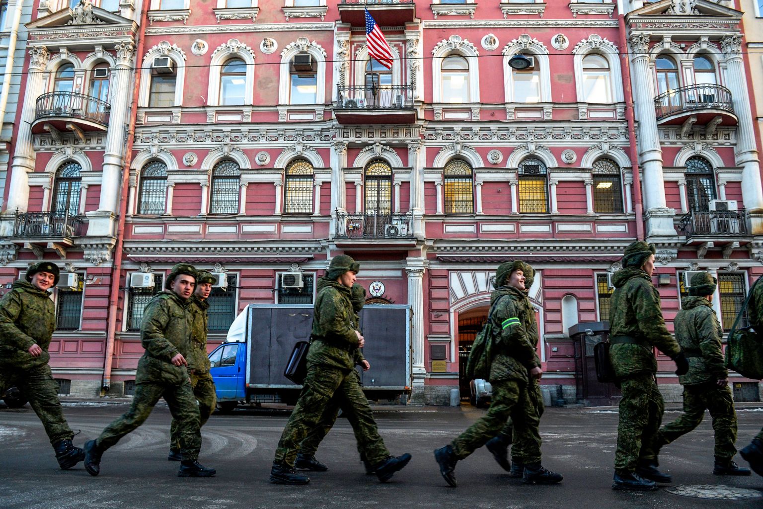 Russian soldiers march past the US Consulate in Saint Petersburg on March 31, 2018.