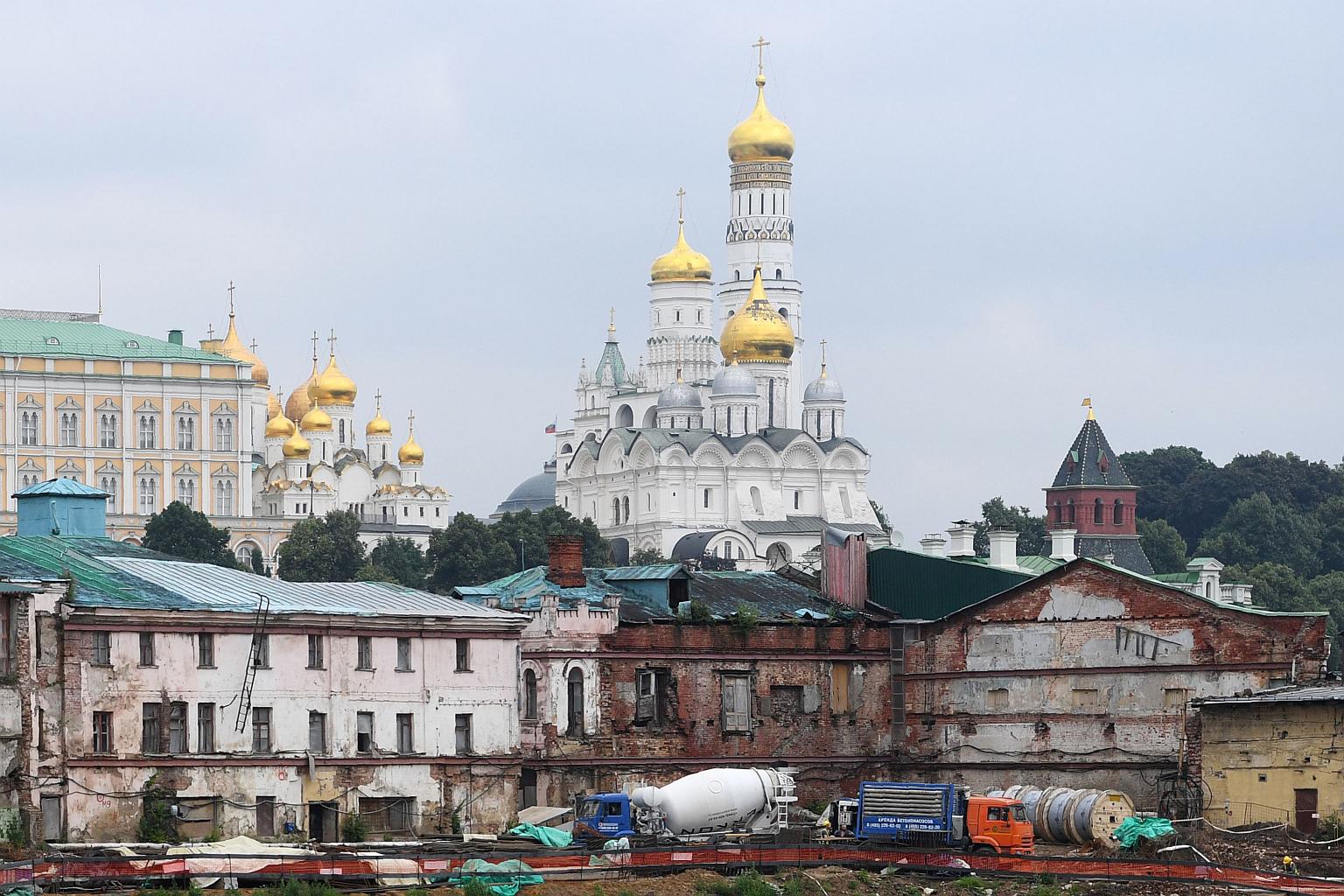 The construction site of a new city block on Moscow's Sofiyskaya embankment, with the Kremlin's towers and cathedrals seen in the background on July 14 2017.