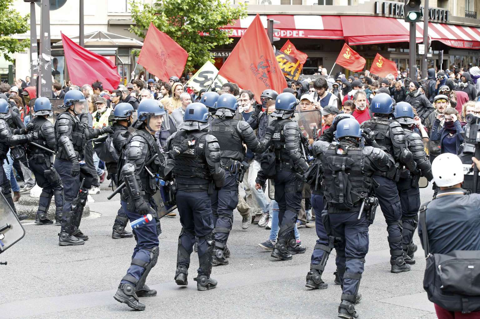 French gendarmes walk in front of striking employees during a demonstration in Paris as part of nationwide protests against plans to reform French labour laws, on June 14, 2016.