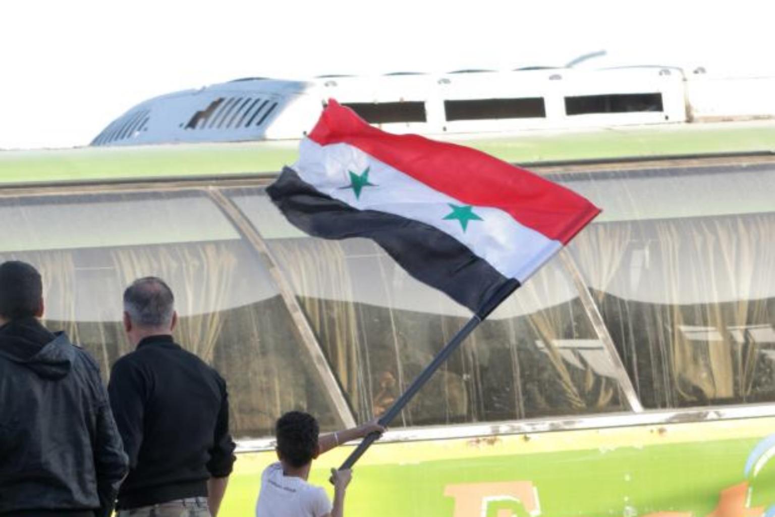 A boy waves a Syrian flag as government buses evacuated al-Islam Army's fighters from Douma, in eastern Ghouta, Syria, on April 9, 2018.