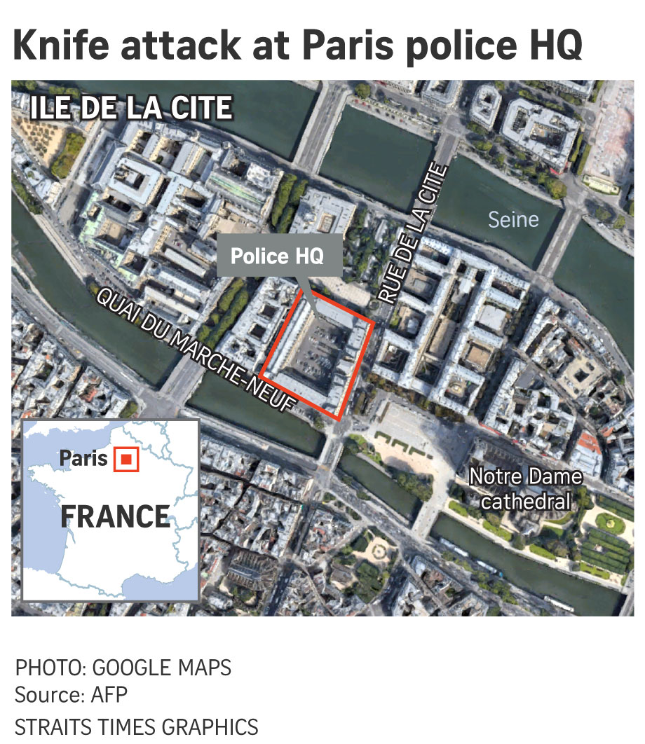 PARIS (AFP) - A man wielding a knife stabbed and killed four officers at the police headquarters in the heart of central Paris on Thursday (Oct 3), before being shot dead.