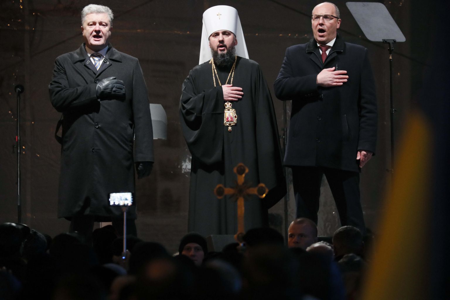 (From left) Poroshenko, Epifaniy and Parliamentary Speaker Andriy Parubiy singing the national anthem in Kiev.