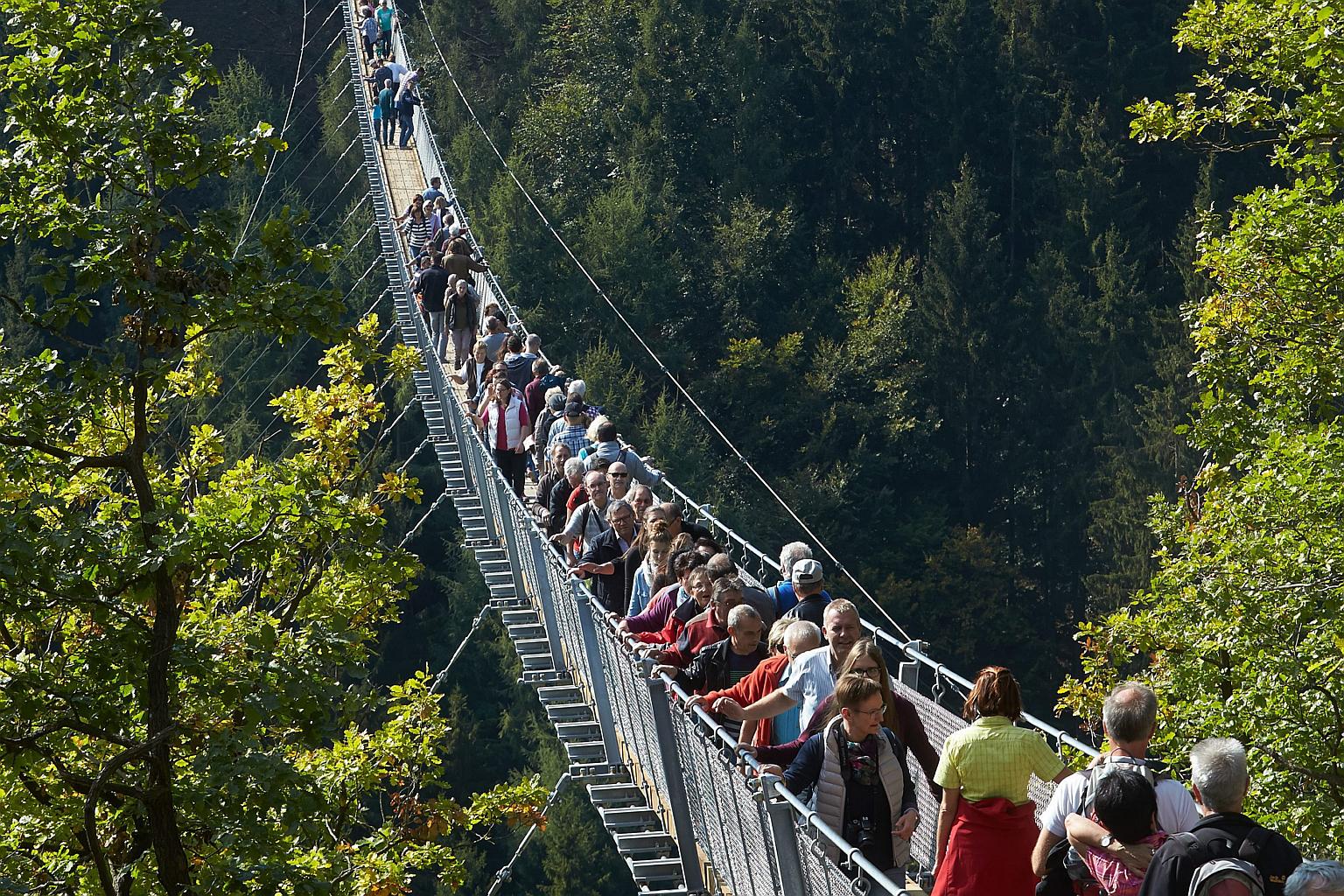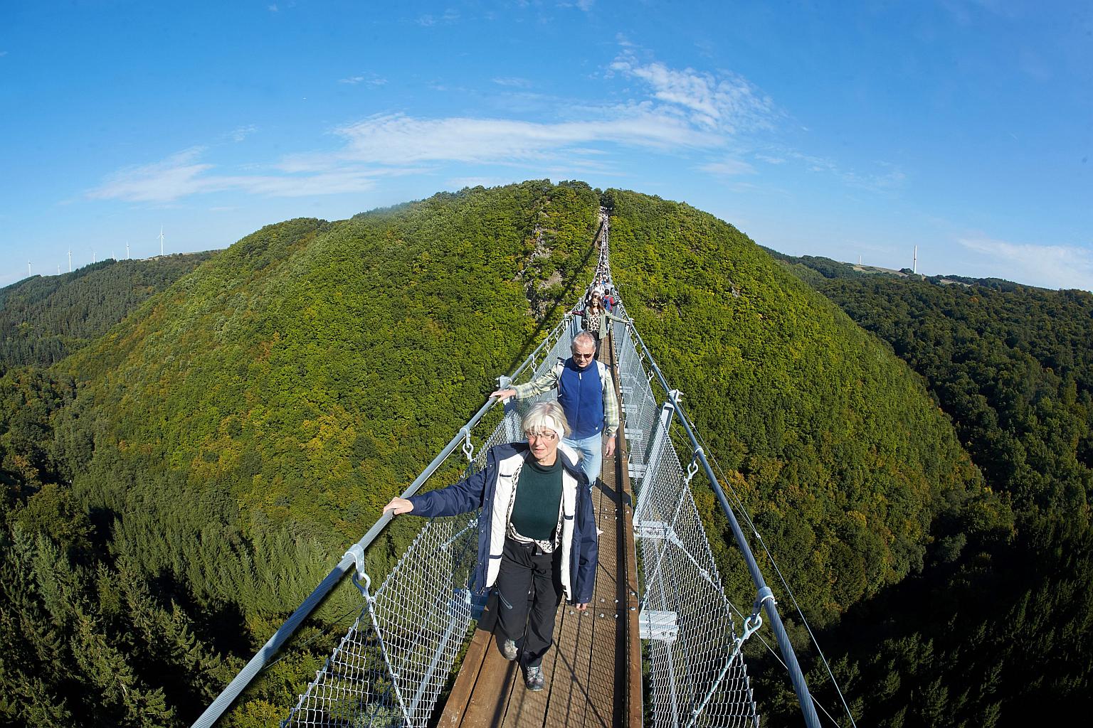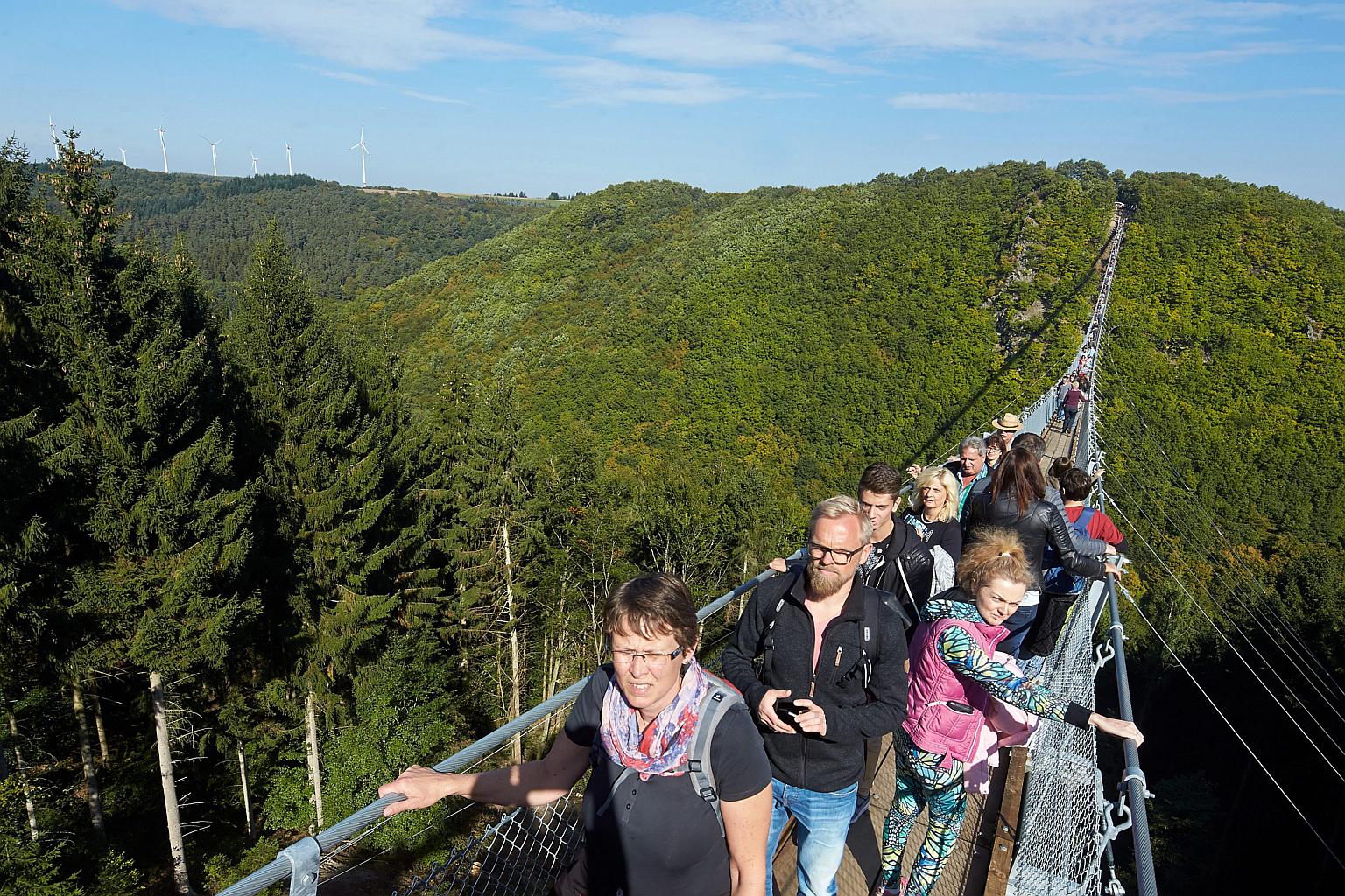 Fearless tourists crossing the newly erected Geierlay rope suspension bridge while soaking in the stunning scenery.