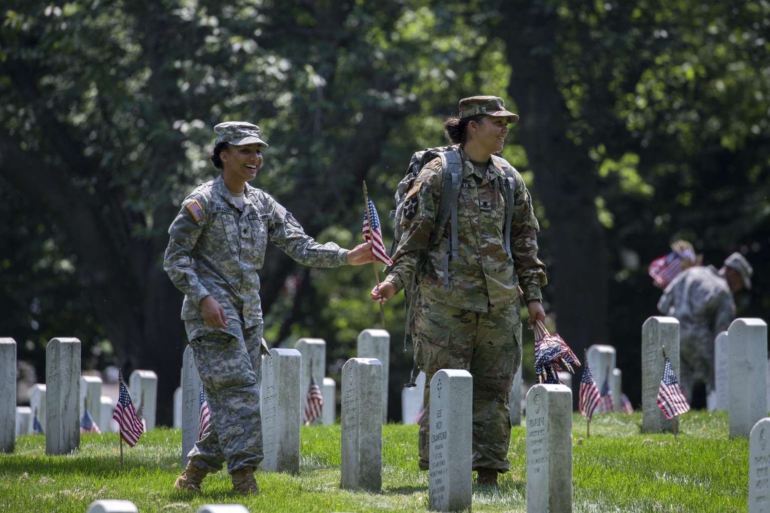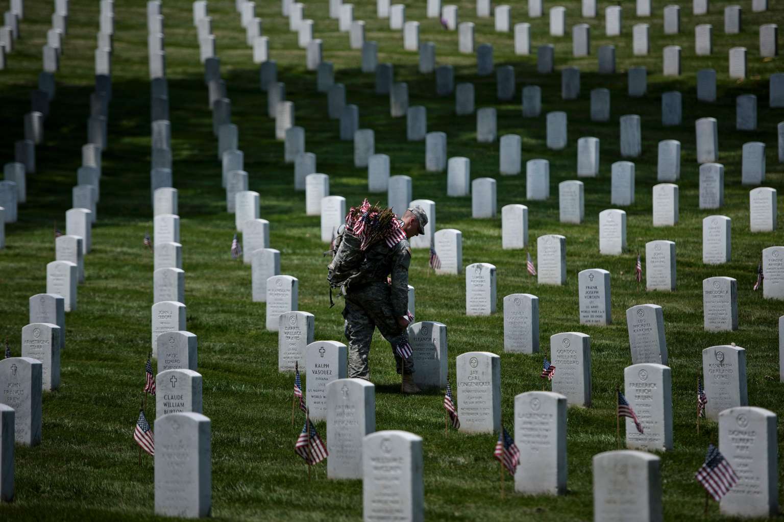 A soldier places American flags at graves in Arlington National Cemetery on May 26, 2016, in Arlington, Virginia, in preparation for Memorial Day.