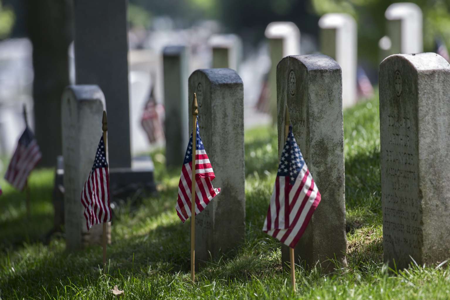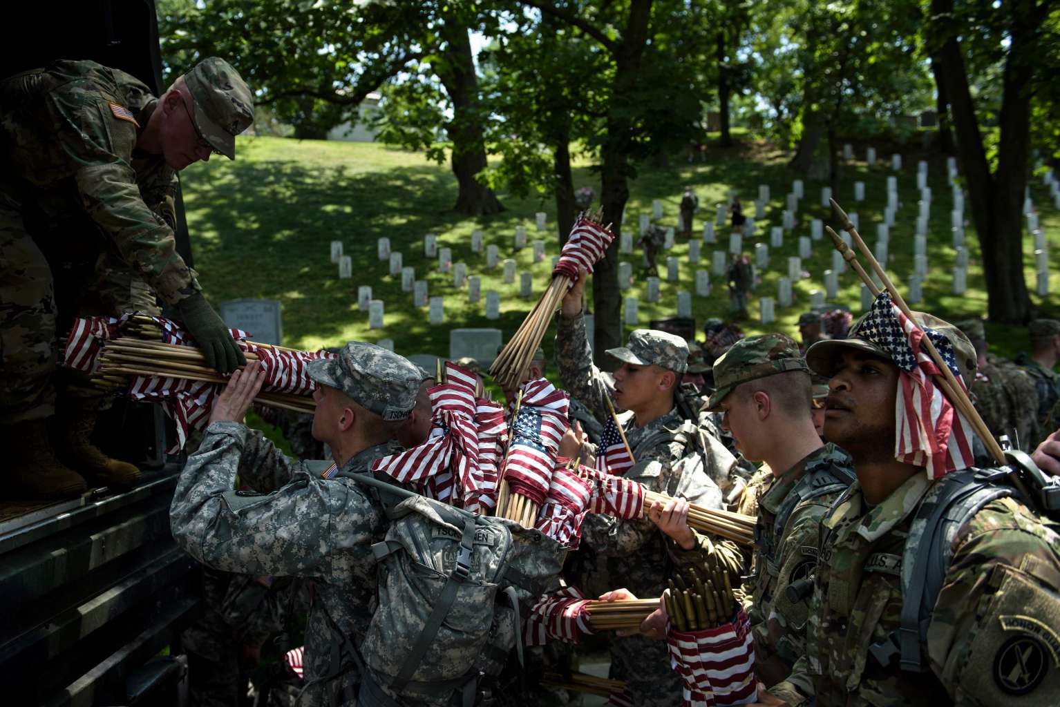 American flags placed by soldiers from the 3rd US Infantry Regiment, The Old Guard, during the Flags In ceremony for Memorial Day, at Arlington National Cemetery in Arlington, Virginia, US, on May 26, 2016.