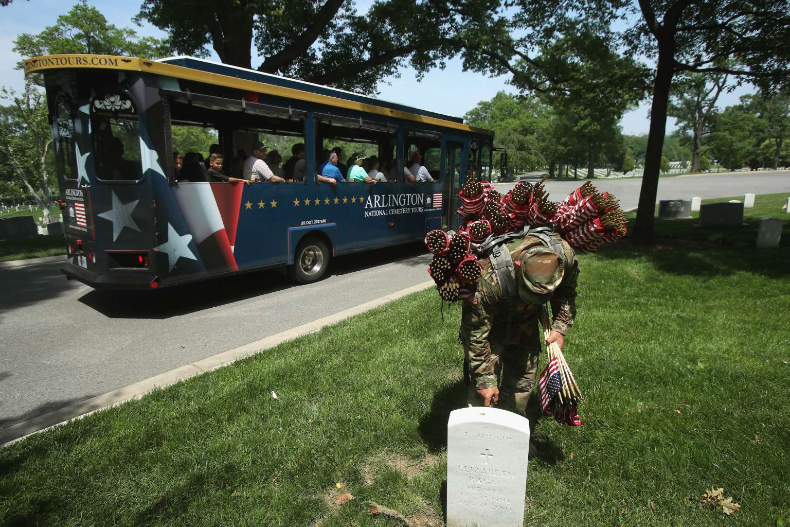 A tour bus passes by as Specialist Jose Barreiro, of the 3rd US Infantry Regiment, The Old Guard, places a flag at a grave site during the Flags In ceremony May 26, 2016, at Arlington National Cemetery in Arlington, Virginia.