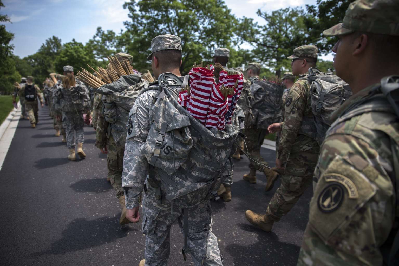 Soldiers from the 3rd US Infantry Regiment, The Old Guard, march with American flags to be placed at every headstone during the Flags In ceremony for Memorial Day, at Arlington National Cemetery in Arlington, Virginia, US, May 26, 2016.