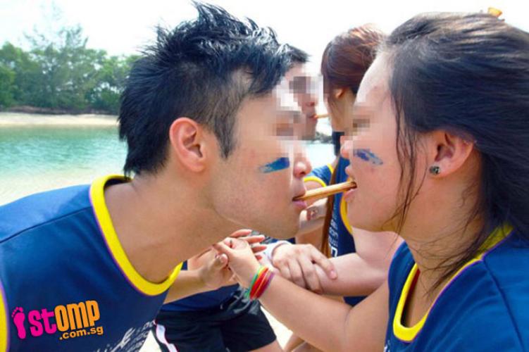 Students passing food with their mouths at a NUS orientation camp.