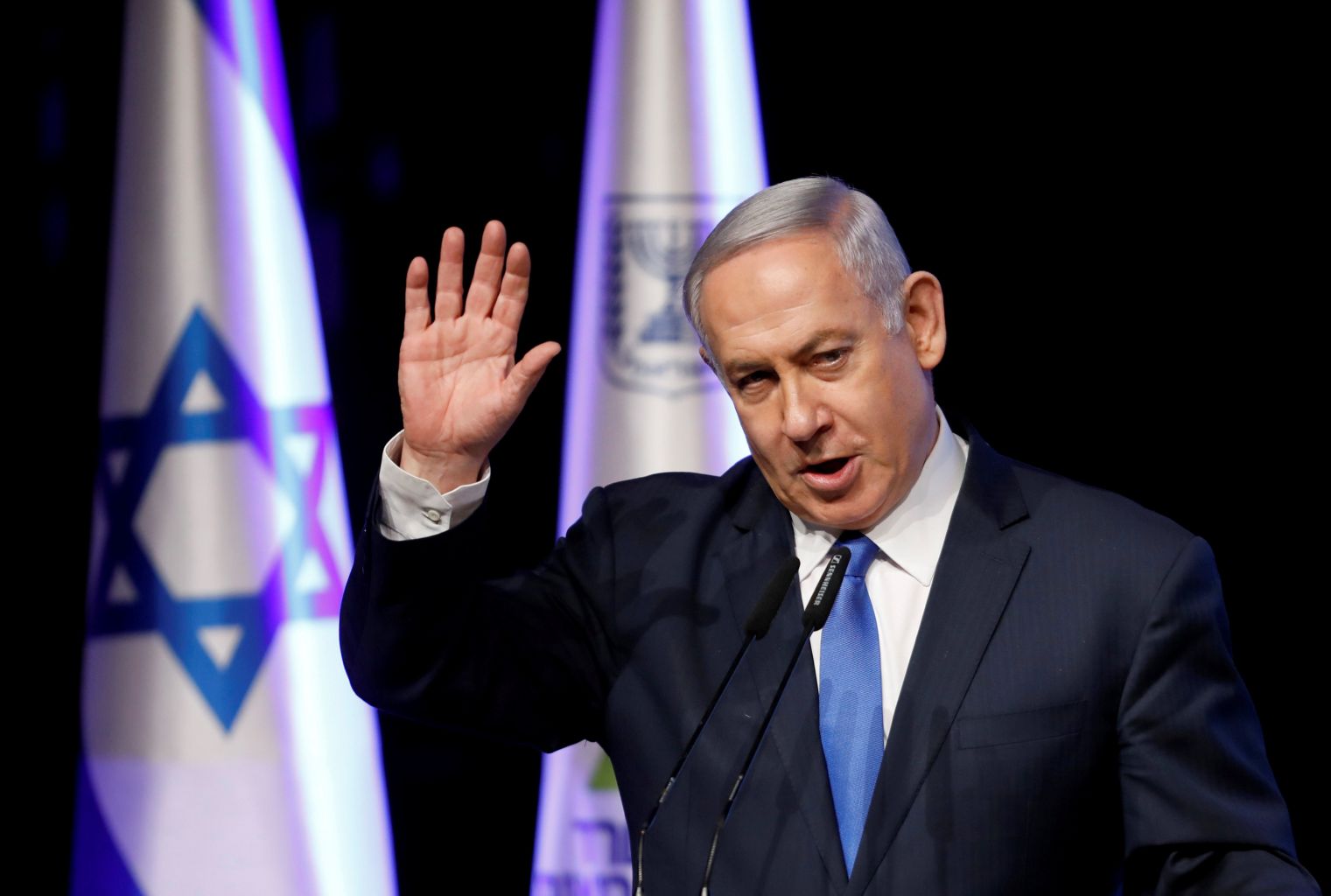 Netanyahu gestures as he addresses a health conference in Tel Aviv, March 27, 2018.