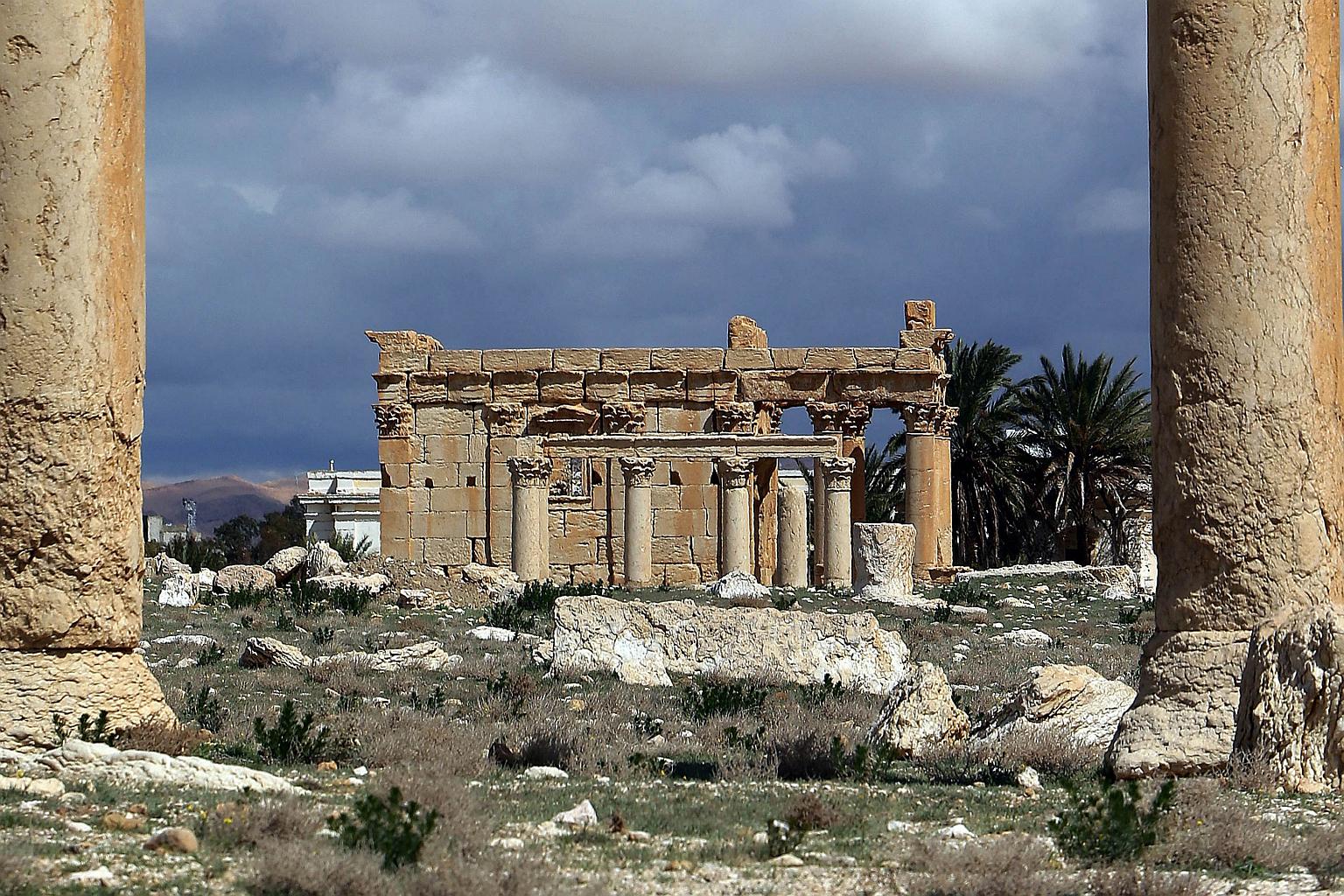 A picture taken on March 14, 2014, shows the Temple of Baal Shamin seen through two Corinthian columns in the ancient oasis city of Palmyra, 215 kilometres north-east of Damascus.