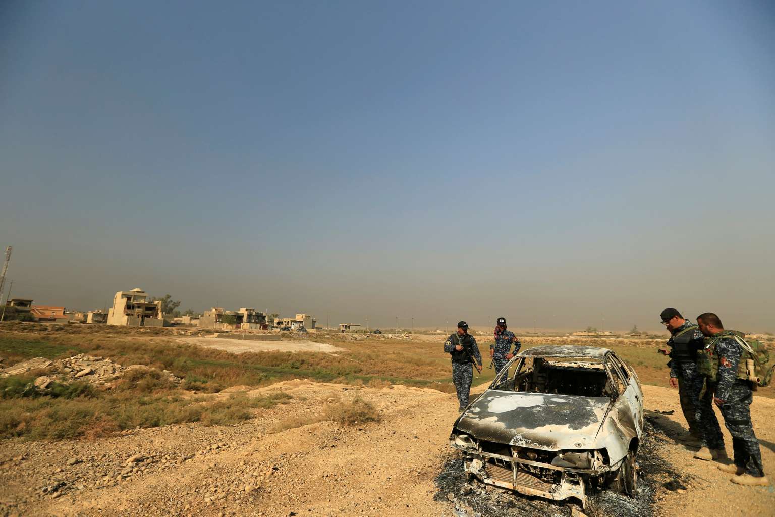 Iraqi security forces inspect a destroyed vehicle from clashes in Hammam al-Ali, south of Mosul, Iraq on Nov 7, 2016.