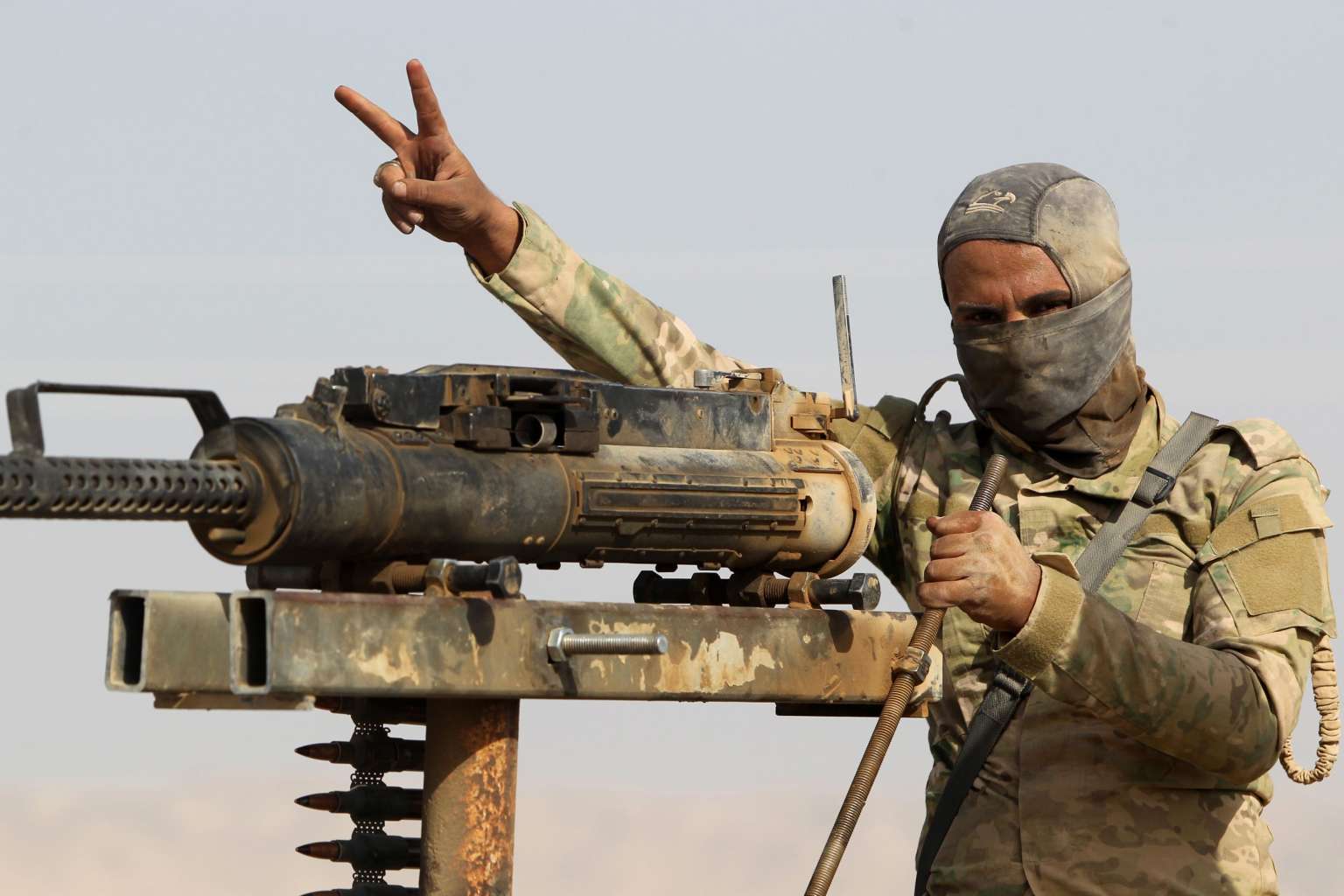 An Iraqi Shi'ite fighter flashes the V for victory sign in the town of Baiji during fighting against ISIS on Oct 16, 2015.