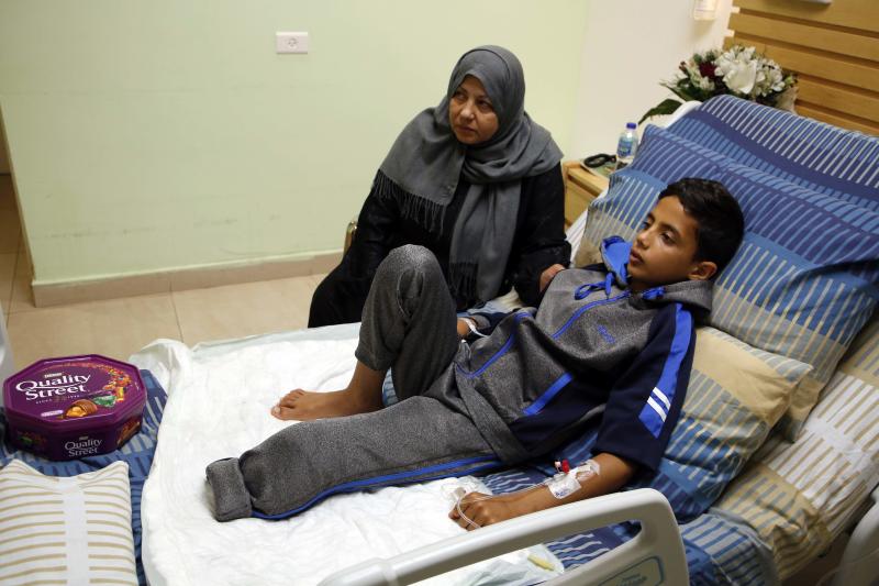 Abdel Rahman Nawfal, 12, sits next to his grandmother in a hospital in the West Bank city of Ramallah on April 23, 2018.