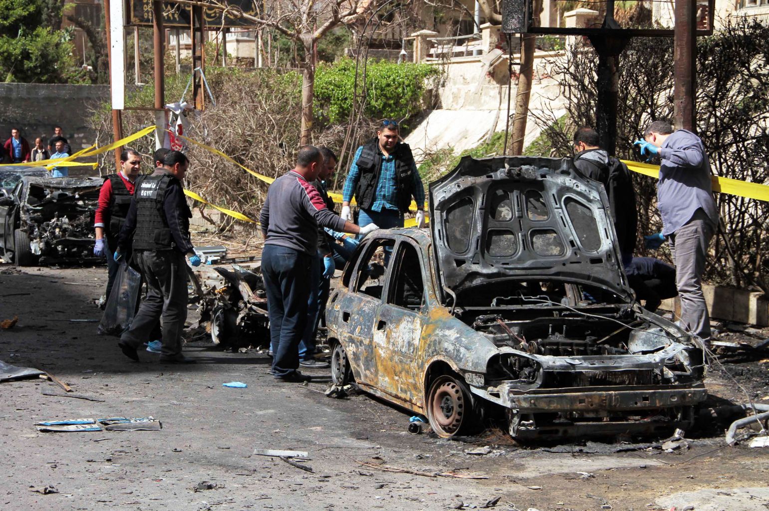 Egyptian forensics check a destroyed vehicle at the site of a bomb attack, which hit a convoy of the city's security chief, in Alexandria on March 24, 2018.