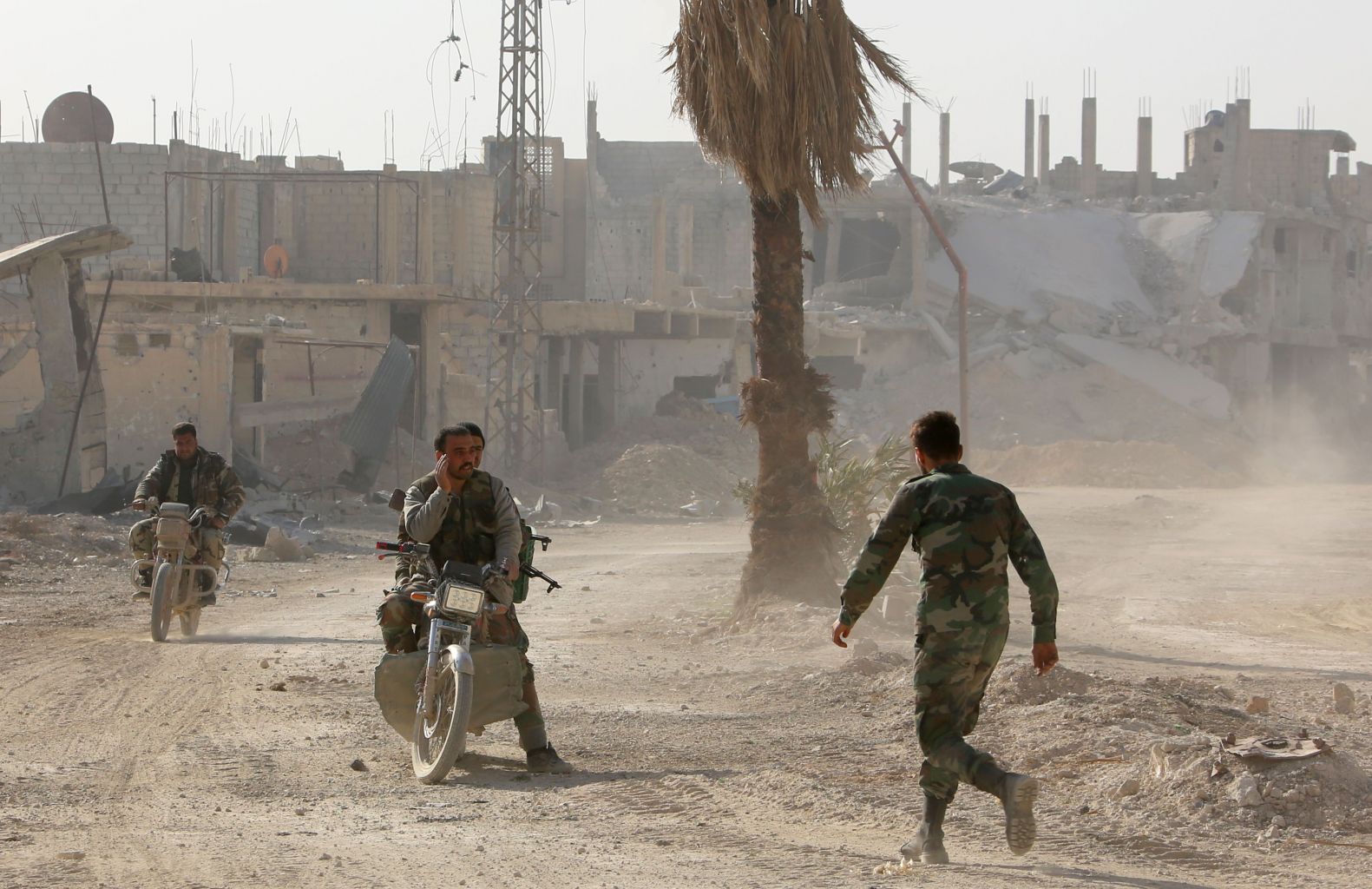 Syrian government forces are seen in the former rebel-held area of Beit Nayem in Eastern Ghouta.