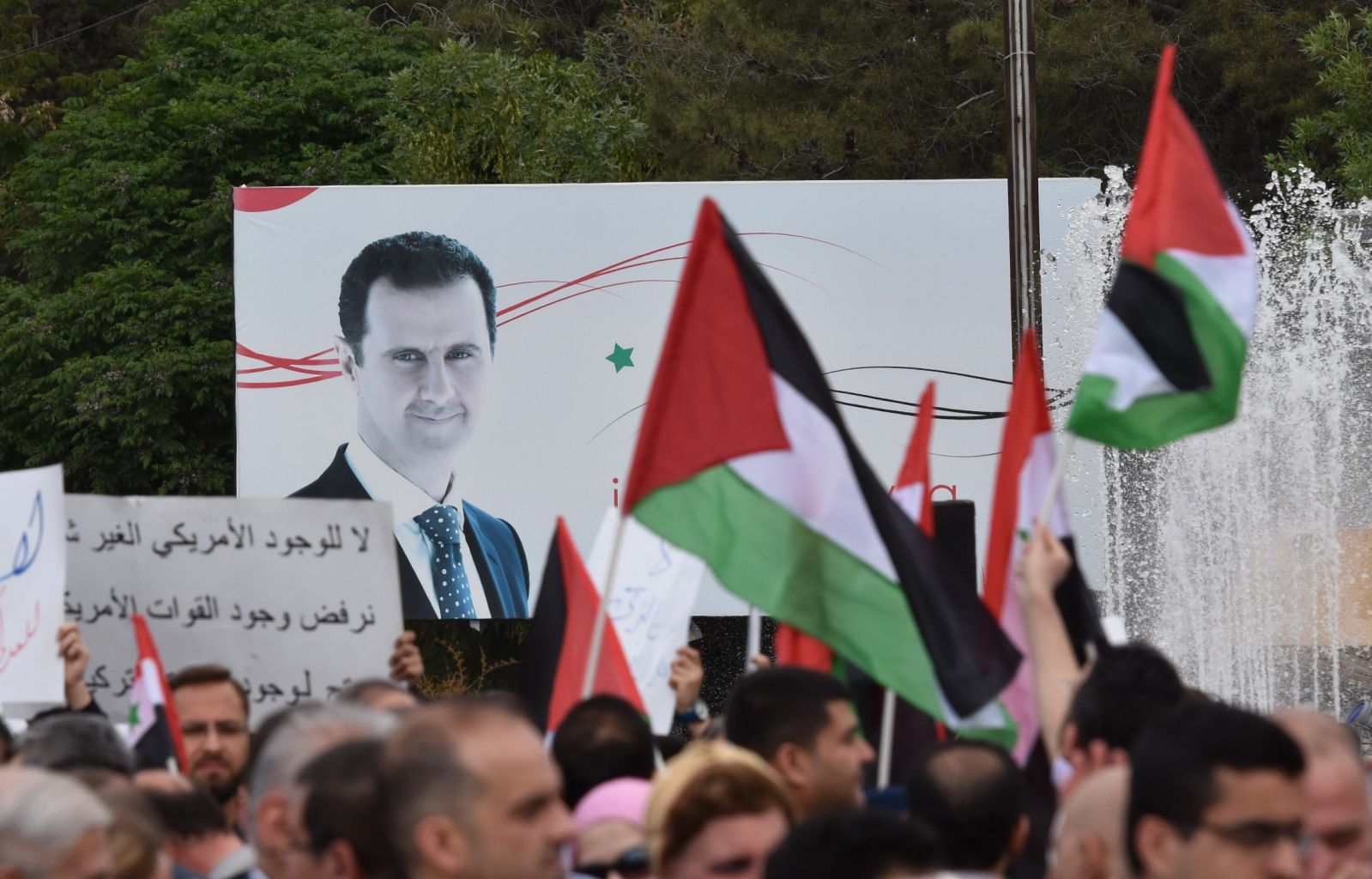 Syrian supporters of President Bashar al-Assad (portrait) gather in the northern city of Aleppo on April 9, 2018, to show support for the regime's operation to retake the totality of the rebel-held area of Eastern Ghouta.