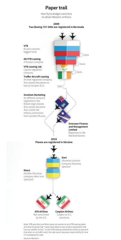 The ownership histories of some of the aircraft tracked by Reuters showed how the US restrictions on supplies to Iranian and Syrian airlines may be skirted. As the ownership skips from one country to the next, the complex paper trail masks the identity of those involved in Syria's procurement of the planes.