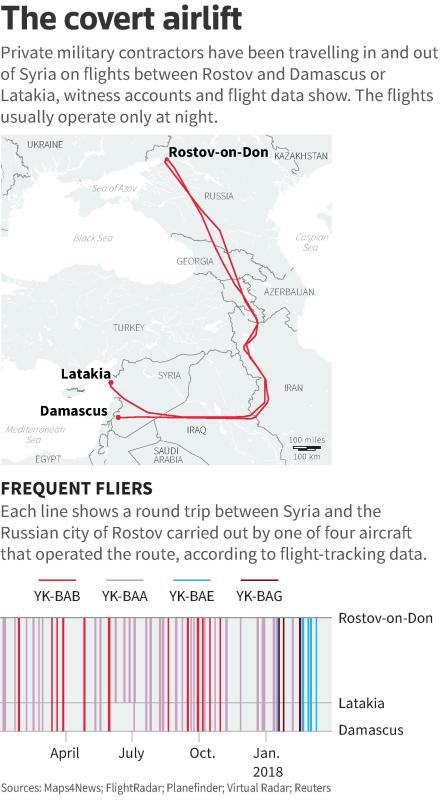 Asked about the flights and the activities of Russian private military contractors in Syria, a spokesman for Russian President Vladimir Putin referred Reuters to the Defence Ministry - which didn't reply to the questions.