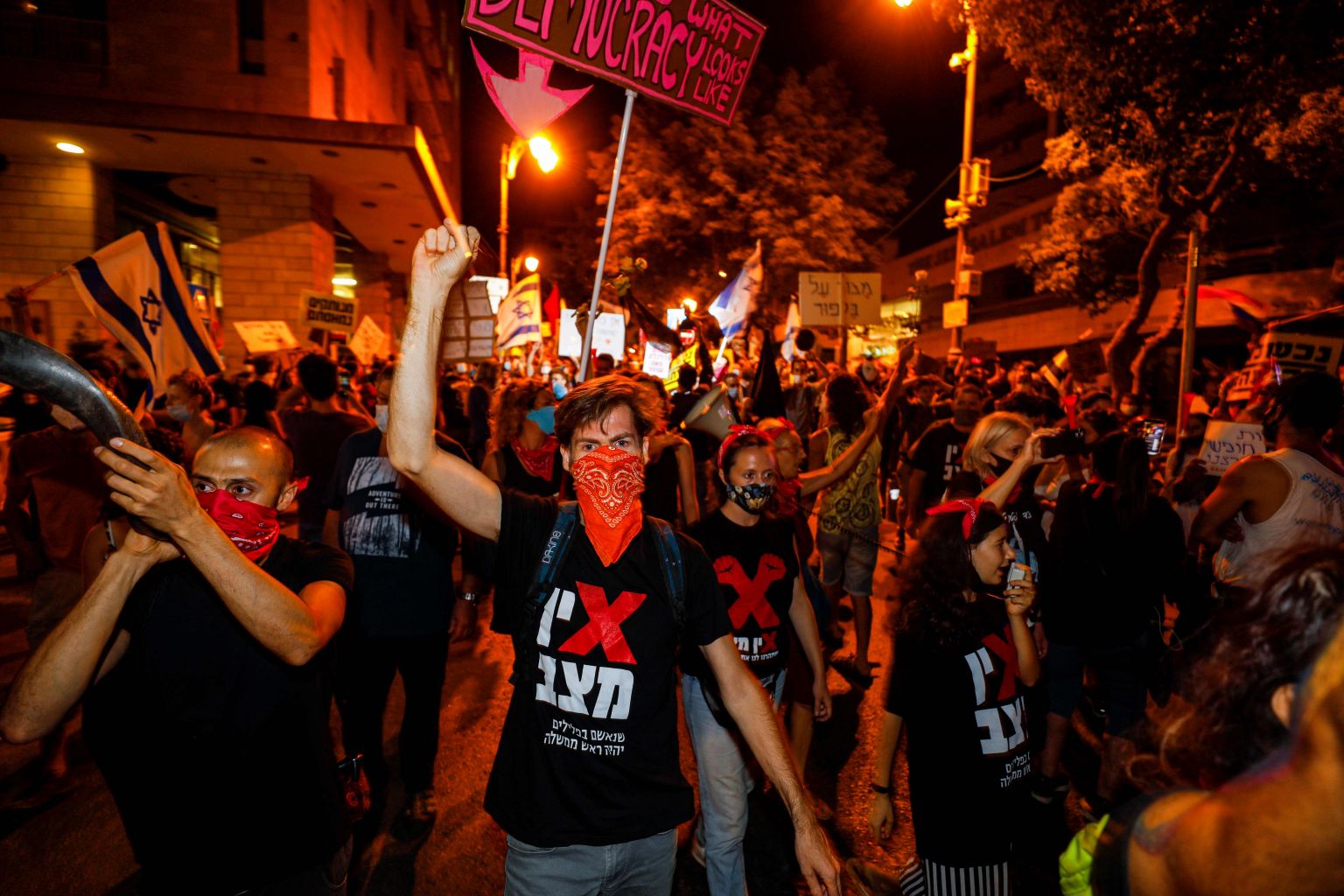 A bandana-clad protester blows a shofar, an ancient musical horn (far left), as he protests against the Israeli government in Jerusalem.