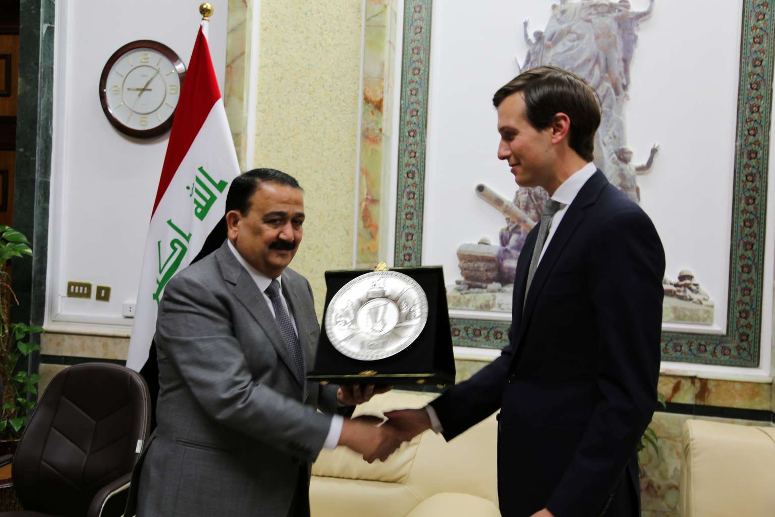 Iraq's Defence Minister Erfan al-Hiyali (left) welcomes Jared Kushner in Baghdad on April 3, 2017.