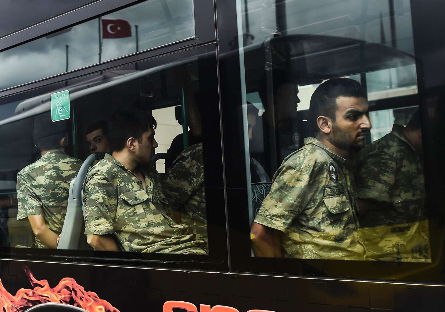 Detained Turkish soldiers who allegedly took part in a military coup arrive in a bus at the courthouse in Istanbul on July 20, 2016.