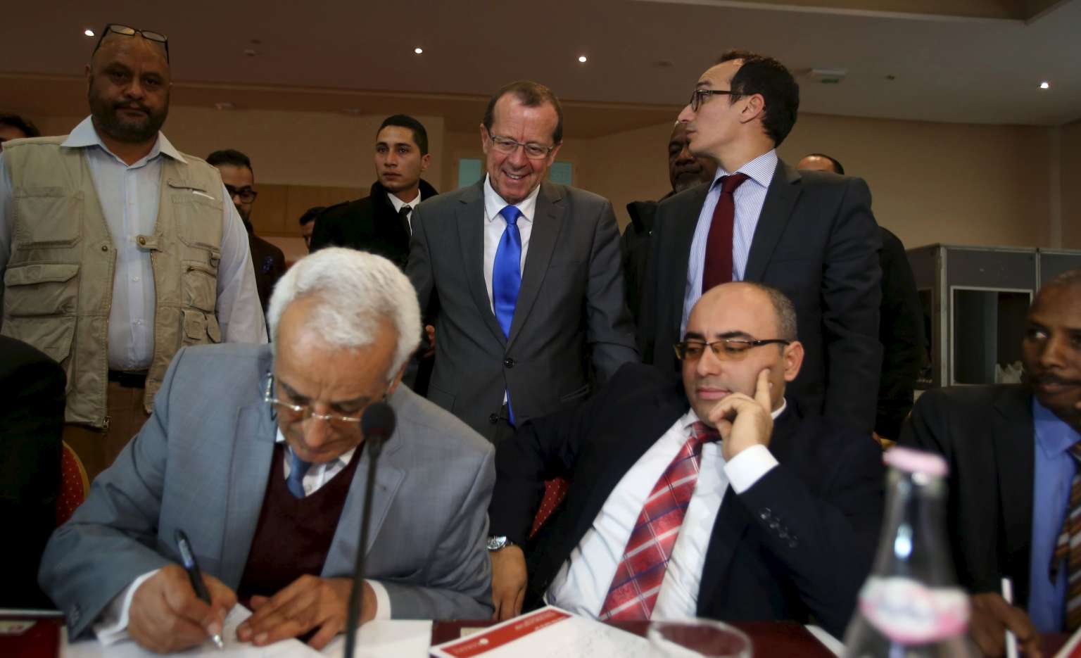 United Nations envoy to Libya, Mr Martin Kobler (centre, standing), looks on as representatives of Libyan municipalities sign documents to support Libya's new national government on Dec 21, 2015.