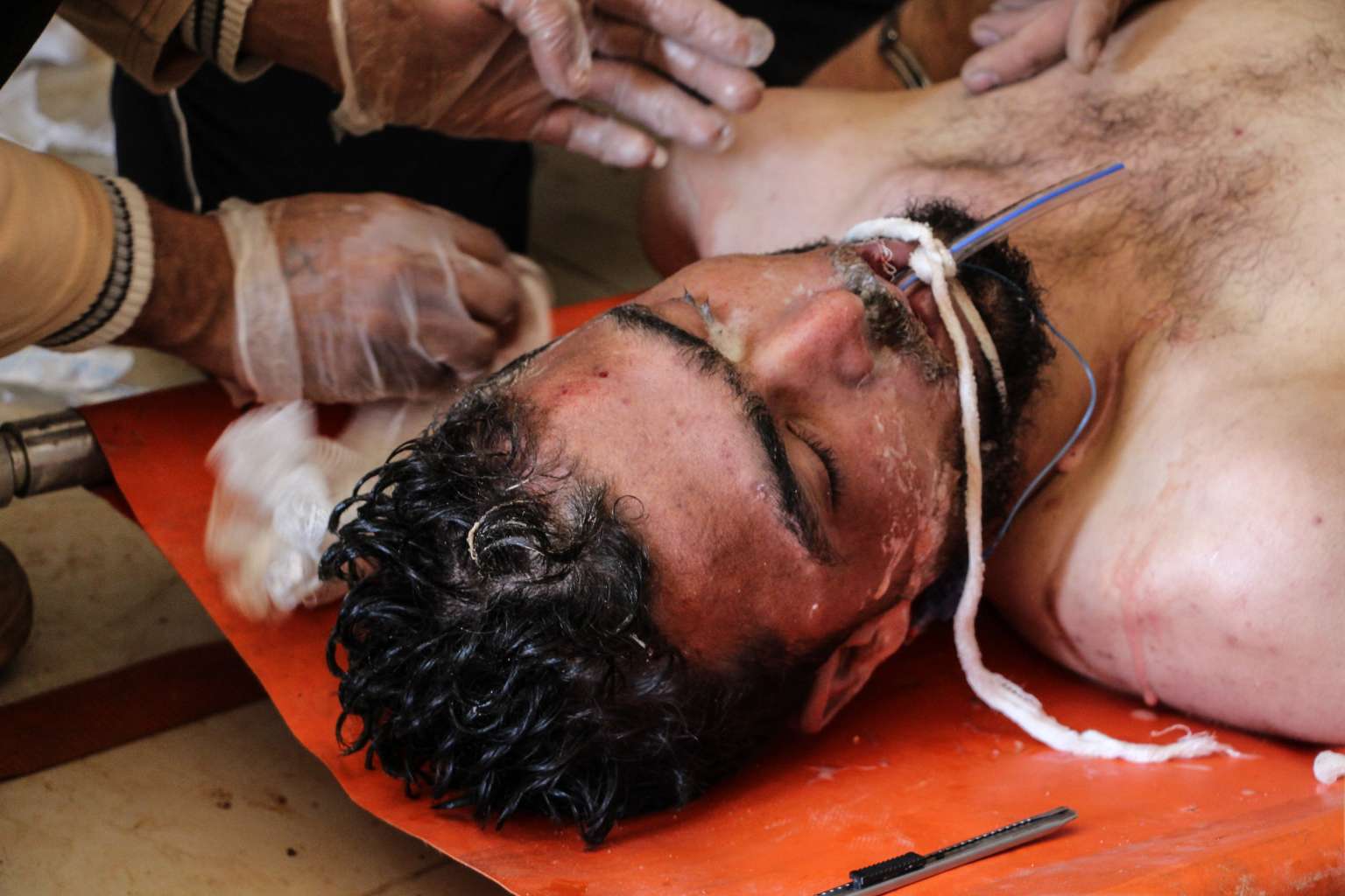 A Syrian man receives treatment after an alleged chemical attack at a field hospital in Saraqib, Idlib province, northern Syria.