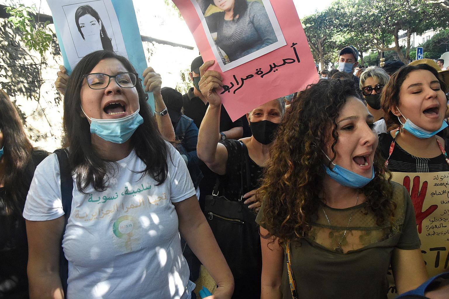 Algerian activists rallying to denounce the brutal murder of a 19-year-old woman and those of the 38 other women killed this year, in Algiers on Oct 8, 2020.