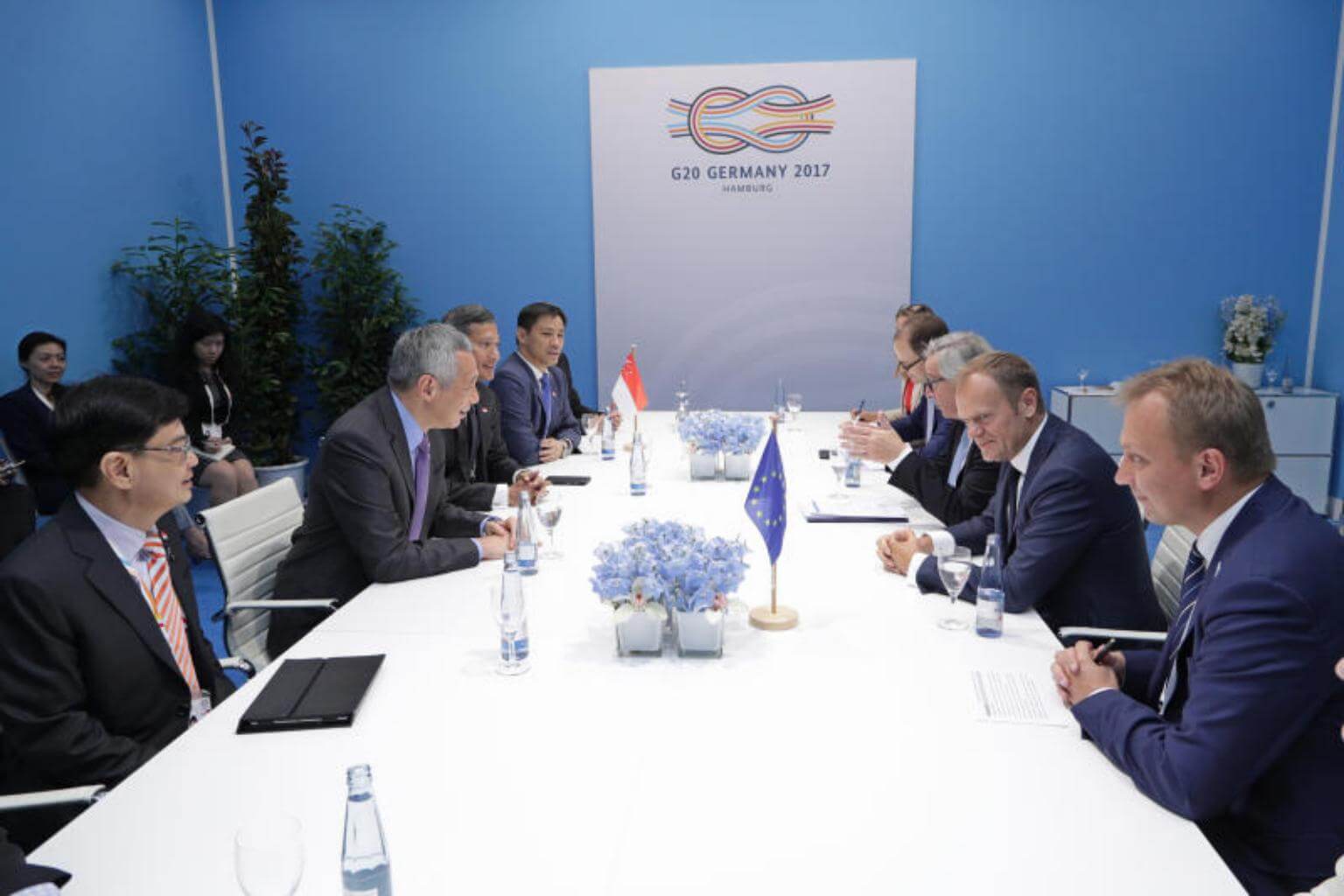 Prime Minister Lee Hsien Loong meets President of the European Council Donald Tusk and President of the European Commission Jean-Claude Juncker at the G20 Summit on July 8, 2017.