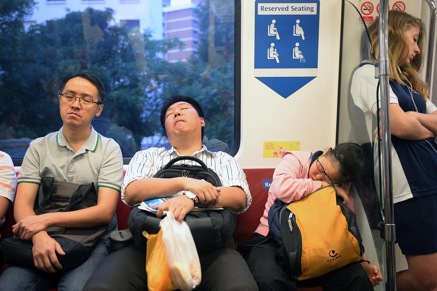 Early morning commuters catching some sleep on the MRT in Singapore.