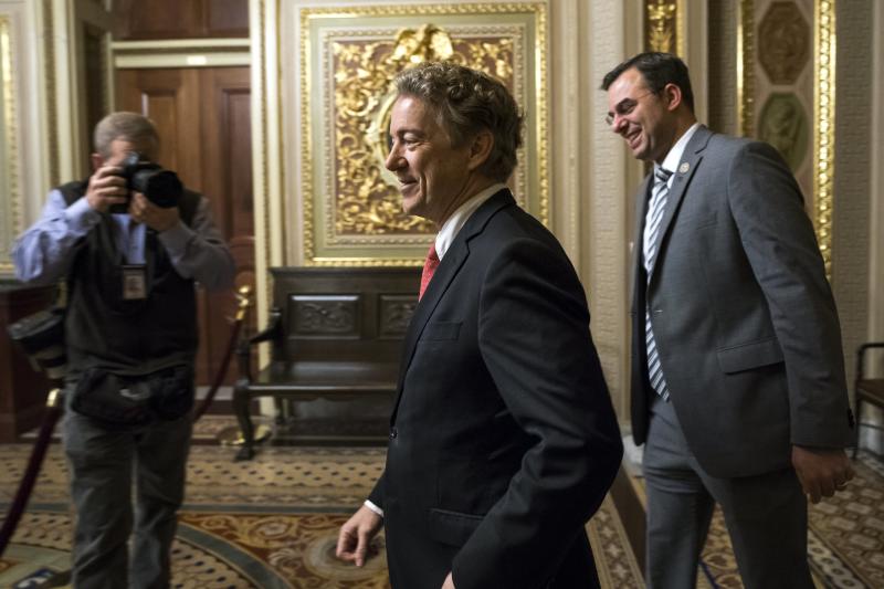 Republican Senator from Kentucky Rand Paul (centre) and Republican Representative from Michigan Justin Amash (right) walk to the Senate floor as budget negotiations continue in the US Capitol in Washington, DC, on Feb 8, 2018.