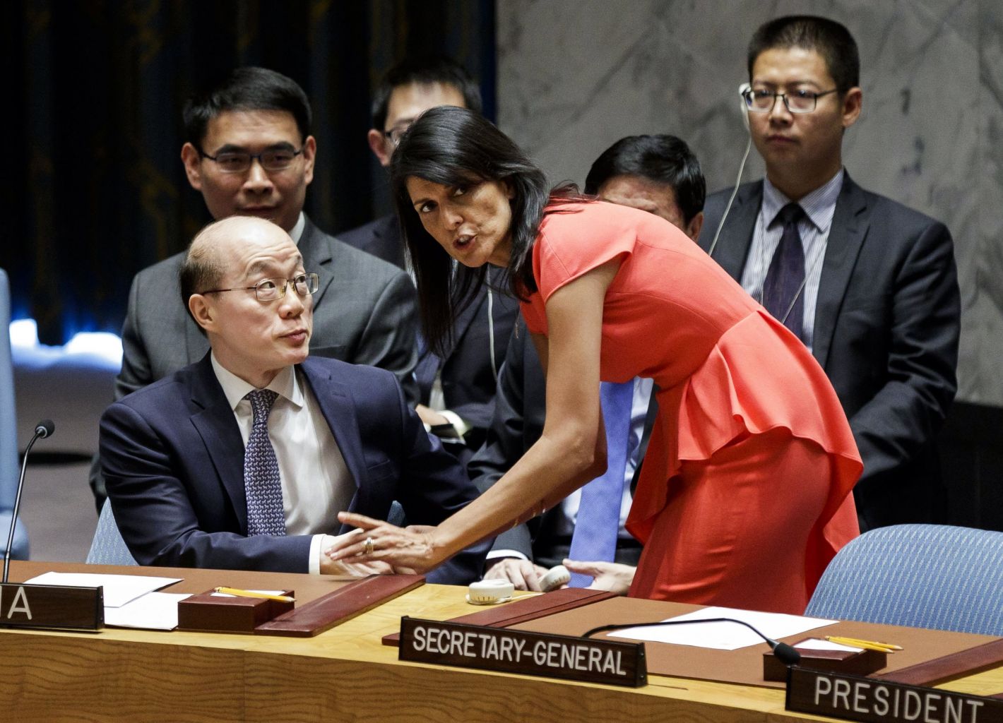 US Ambassador to the UN Nikki Haley (right) talks to China's Liu Jieyi (left) before the vote.