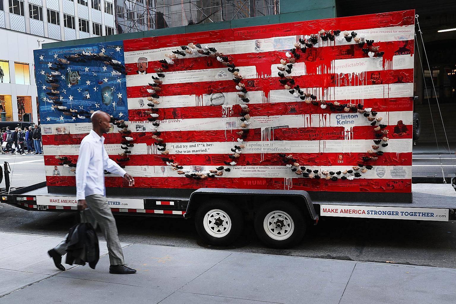 A rolling art installation commenting on the state of politics in America sits in the road in Manhattan.