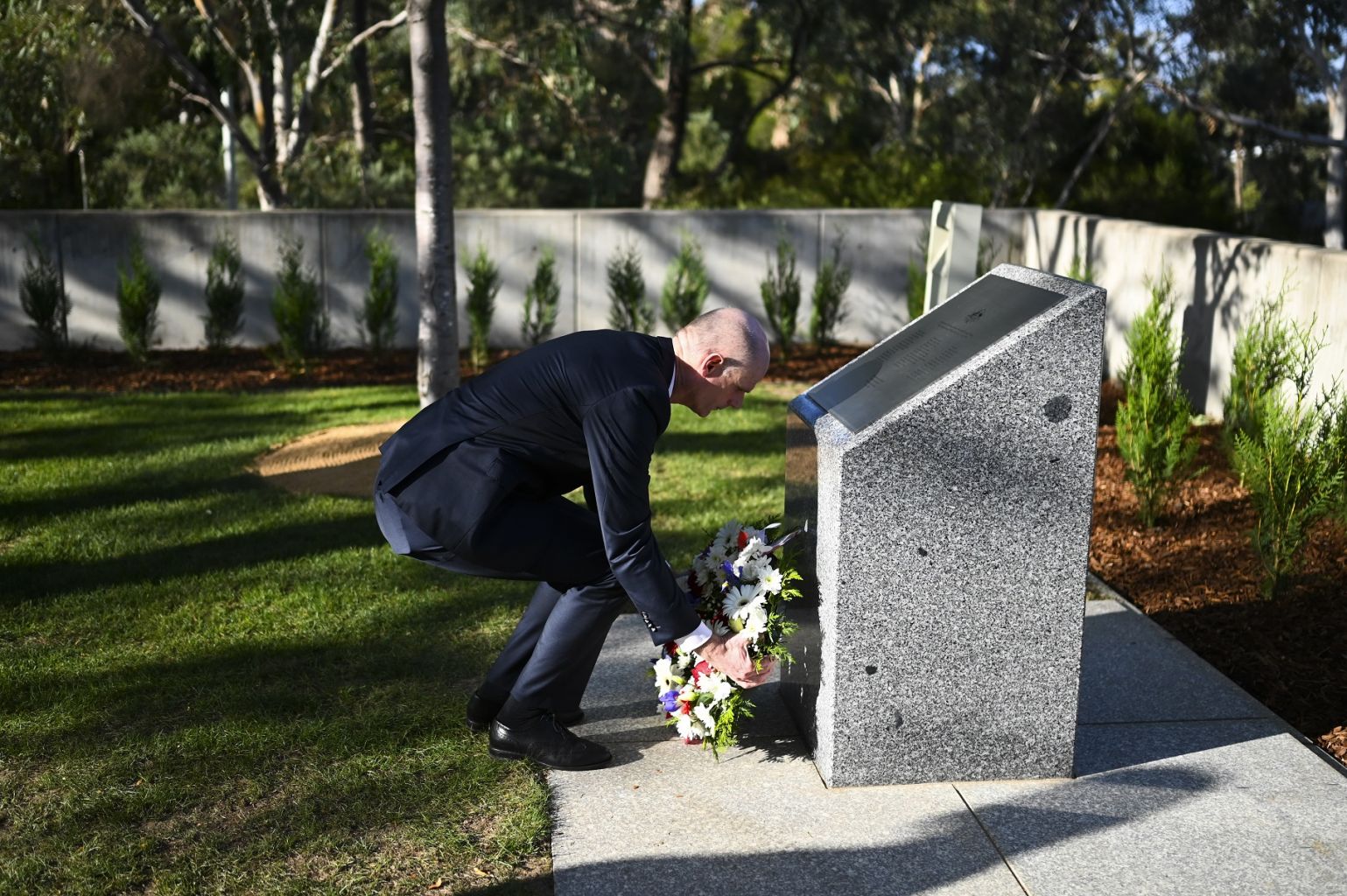 Dutch Minister of Foreign Affairs Stef Blok lays a wreath at the MH17 memorial plaque outside Parliament House in Canberra, Australia, on March 27, 2019.