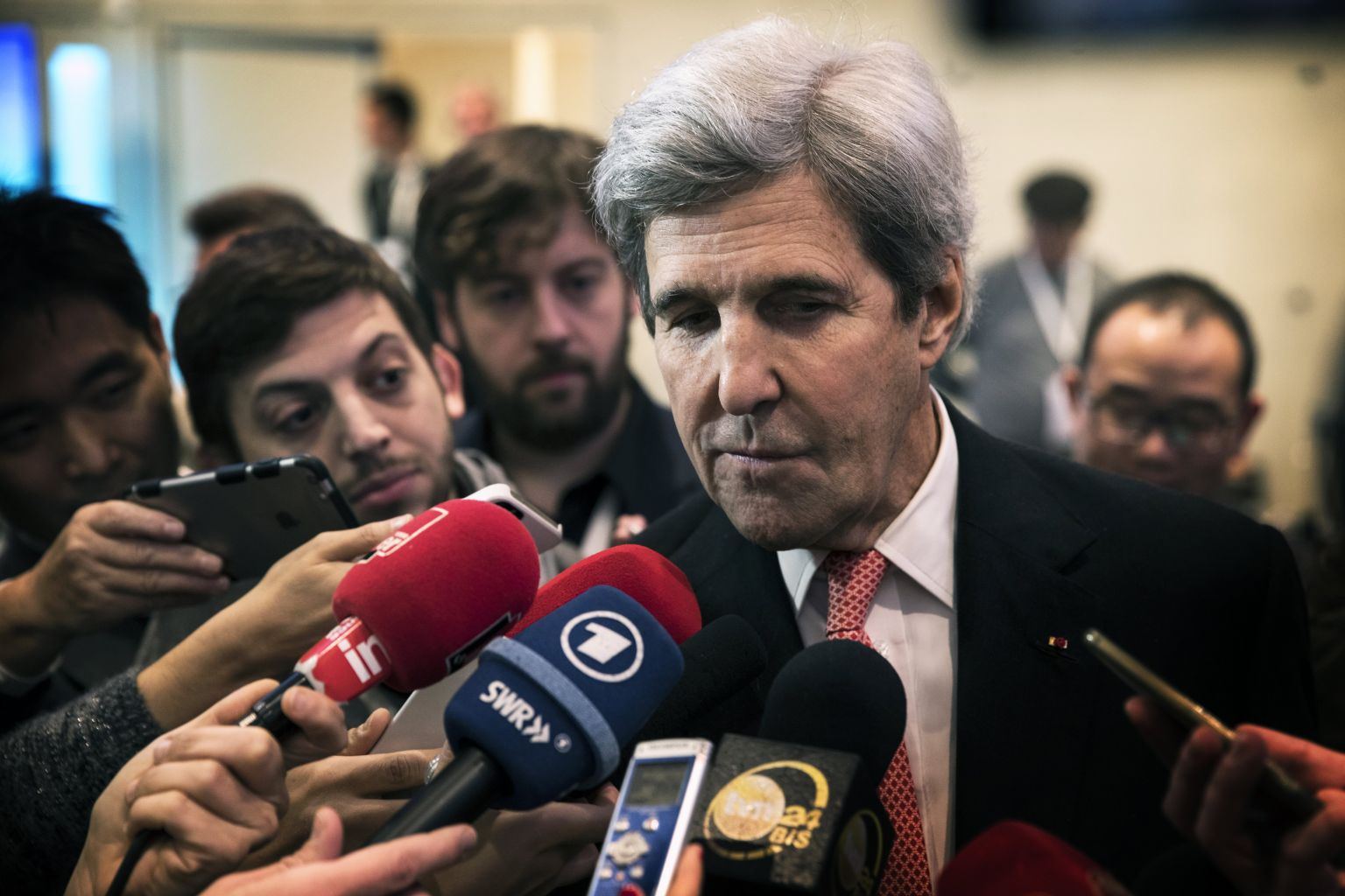 Former US secretary of state John Kerry speaking to the media at the One Planet Summit at the Seine Musicale on the Ile Seguin near Paris on Dec 12, 2017.