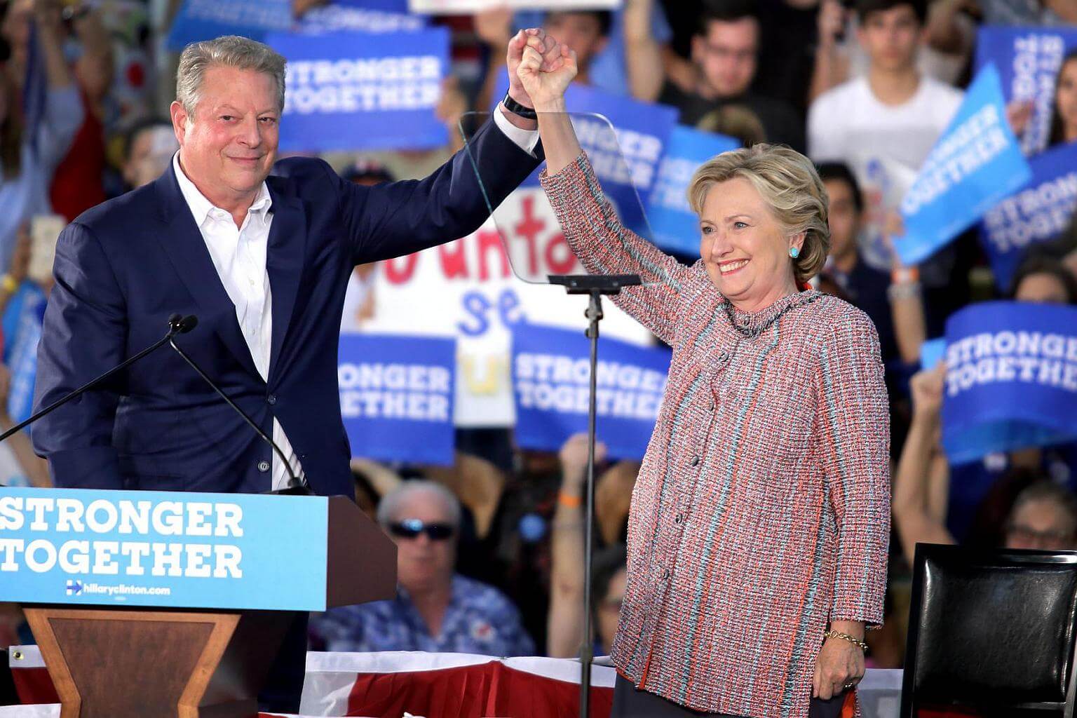 Former Vice President Al Gore (left) shakes hands with US Democratic party's presidential candidate and former Secretary of State Hillary Clinton (right) during her Presidential campaign at Miami Dade College in Miami, Florida, USA on Oct 11, 2016.
