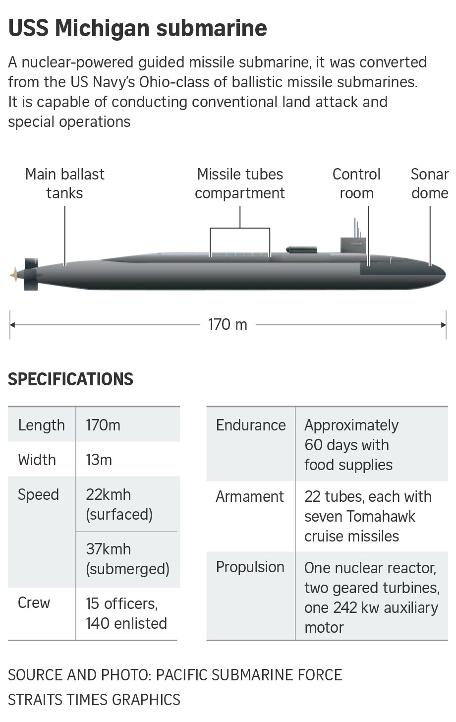 The port call by the USS Michigan came as a US aircraft carrier strike group steamed towards Korean waters and as top envoys for North Korea policy from South Korea, Japan and the United States met in Tokyo.