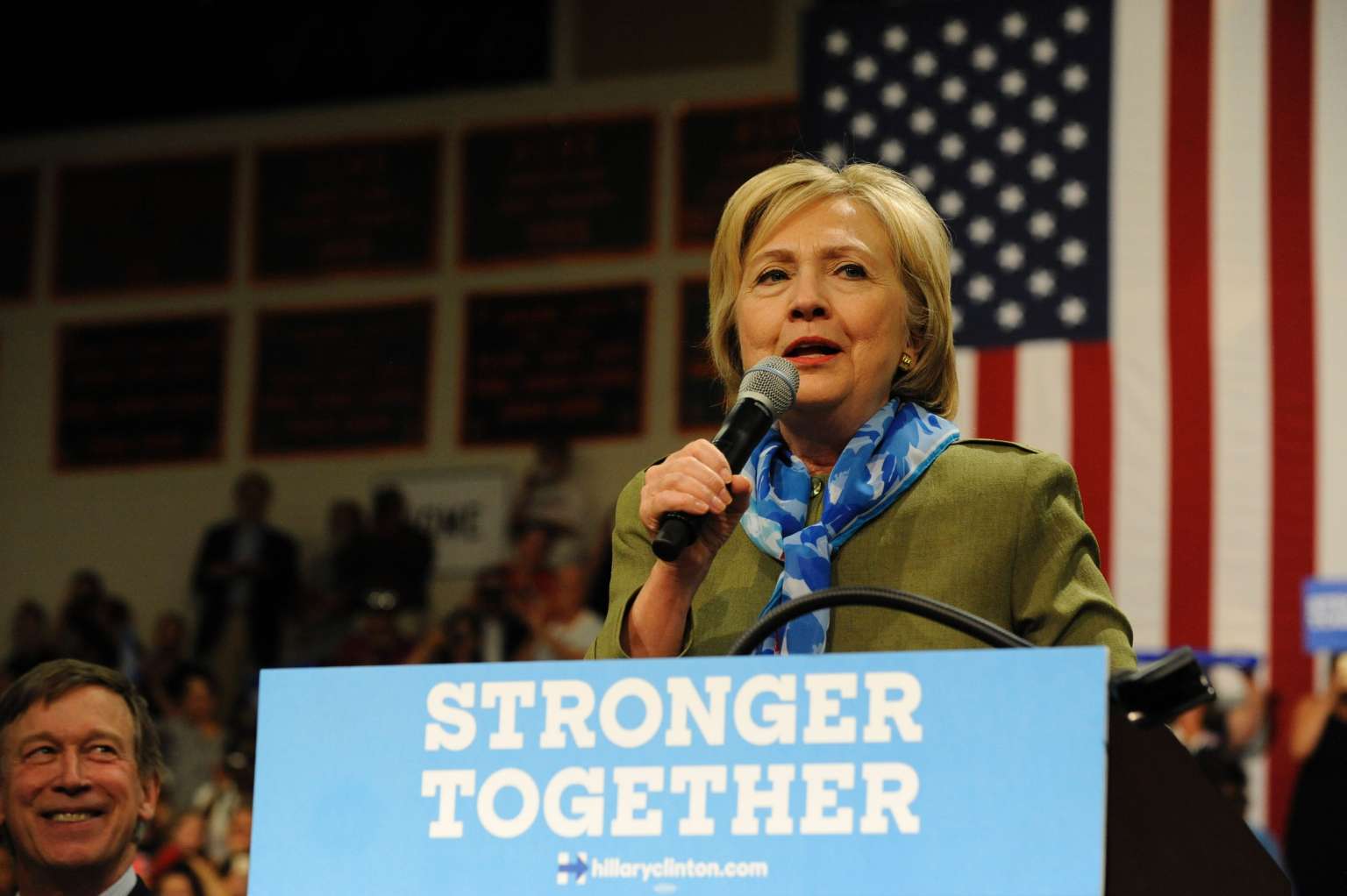 Democratic presidential nominee Hillary Clinton addresses supporters during her campaign stop at Adams City High School in Commerce City, Colorado on Aug 3, 2016.