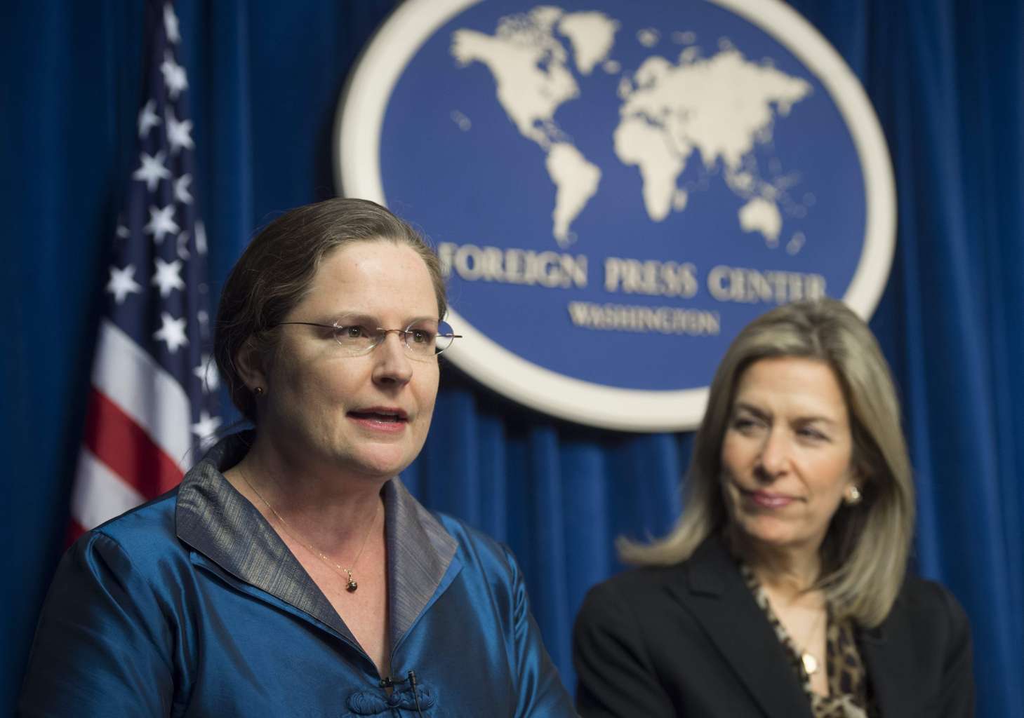 Ms Laura Holgate (left), senior director for weapons of mass destruction terrorism and threat reduction at the National Security Council, and Deputy Energy Secretary Elizabeth Sherwood-Randall speaking in Washington, DC on March 29, 2016 about the Nuclear Security Summit.