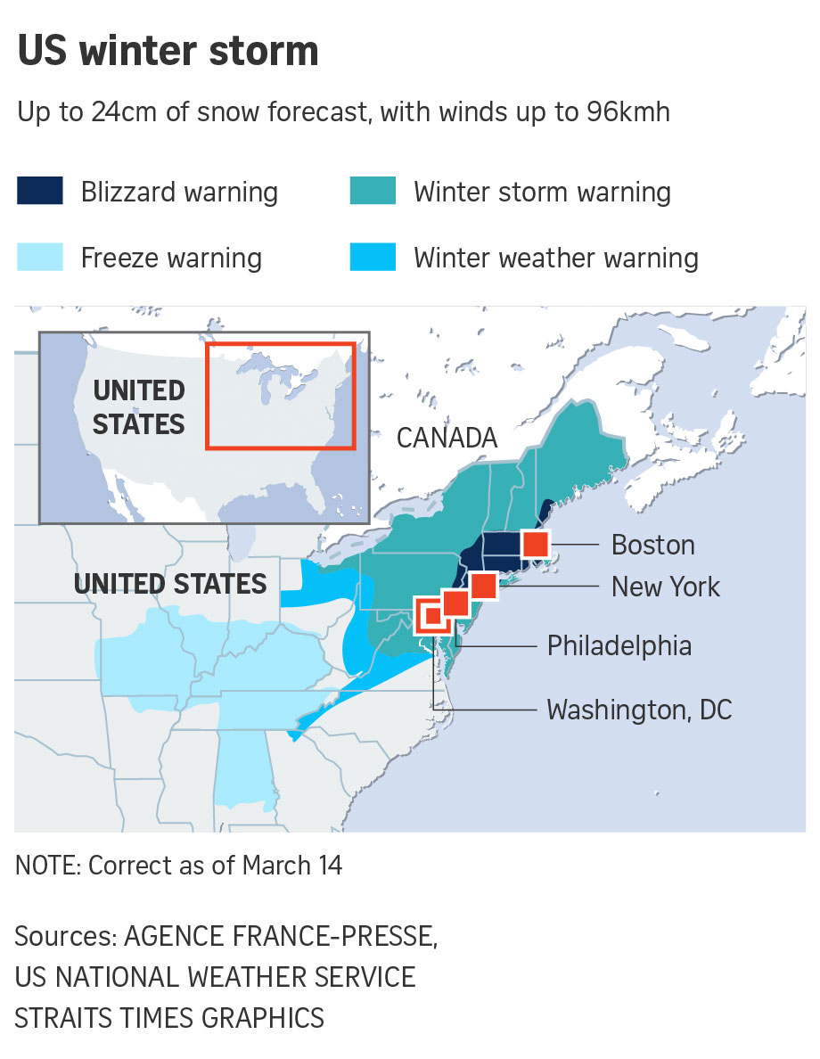 NEW YORK (AFP) - Winter Storm Stella dumped snow and sleet on Tuesday (March 14) across the north-eastern United States where thousands of flights were cancelled and schools closed, but appeared less severe than initially forecast.