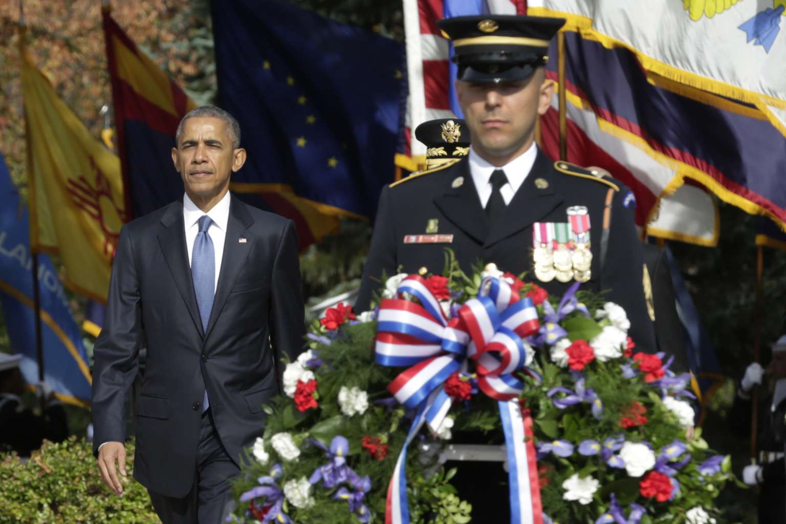 Obama participates in a wreath-laying ceremony at the Tomb of the Unknown Soldier at Arlington National Cemetery to mark Veterans Day on Nov 11, 2016.