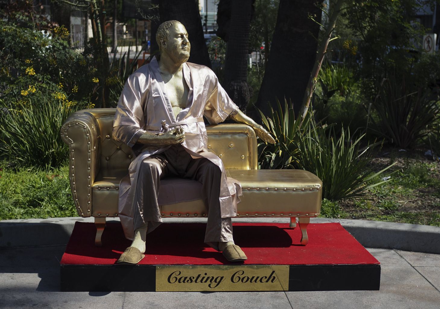 Plastic Jesus and Joshua Monroe created a gold sculpture of Weinstein on the couch, wearing a dressing gown and clutching an Academy Award.