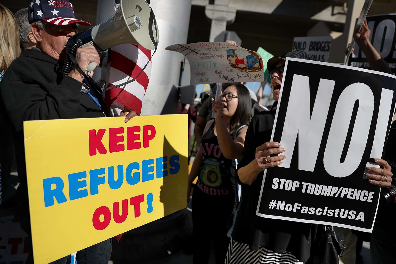 A protester faces off with a supporter of US President Donald Trump during a demonstration against the immigration ban, at Los Angeles International Airport on Jan 29, 2017.