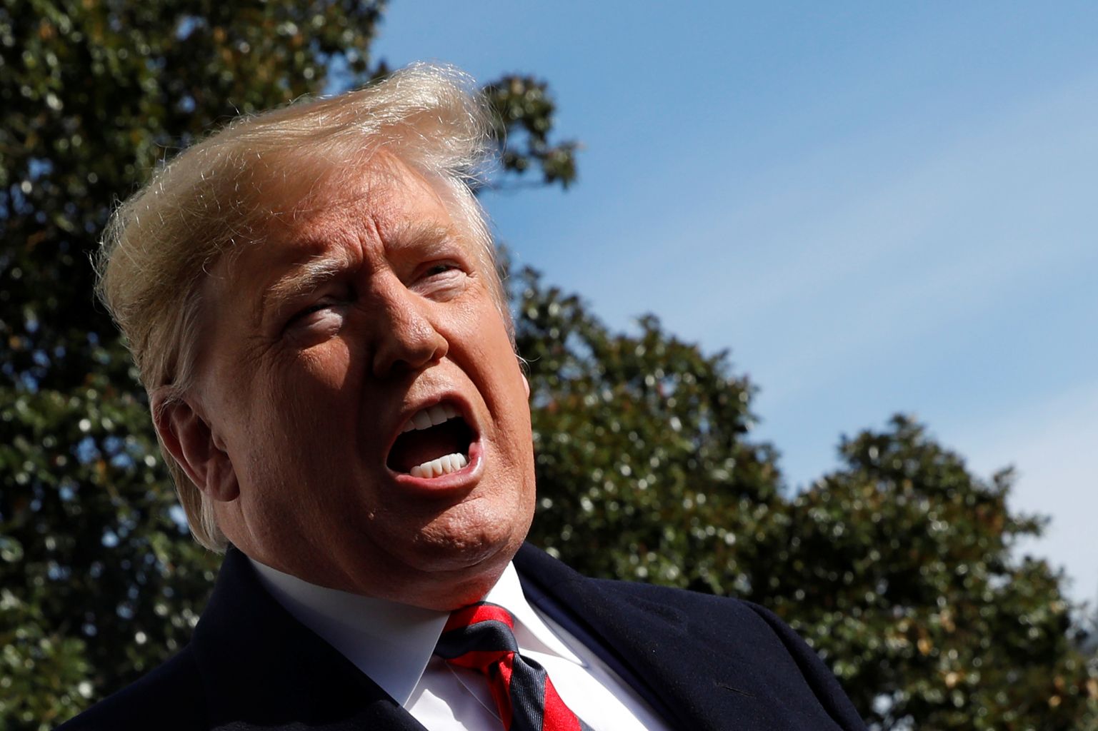 Trump speaks to the media on the South Lawn of the White House in Washington.