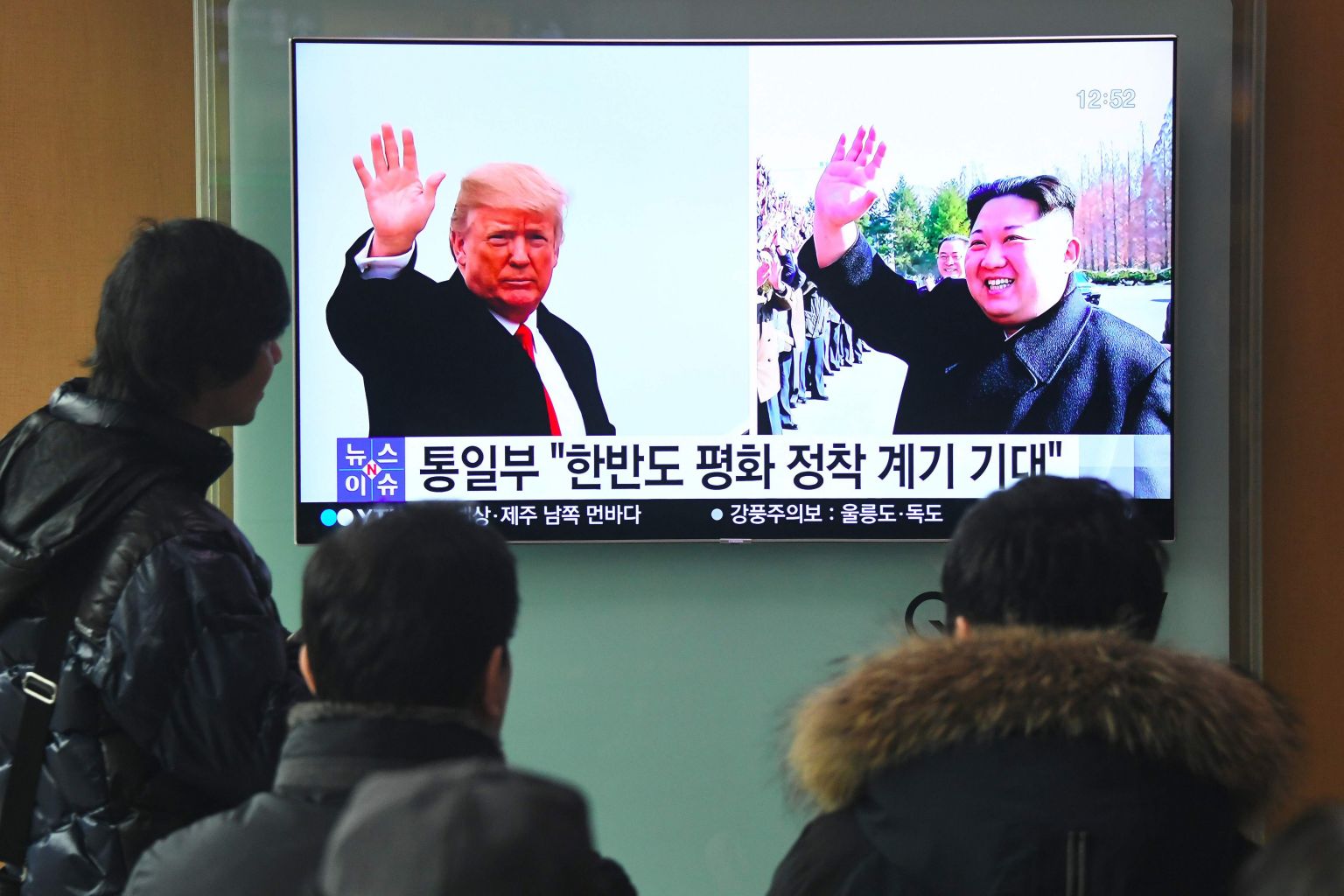 People watching a television news report showing pictures of US President Donald Trump (left) and North Korean leader Kim Jong Un at a railway station in Seoul, on March 9, 2018.