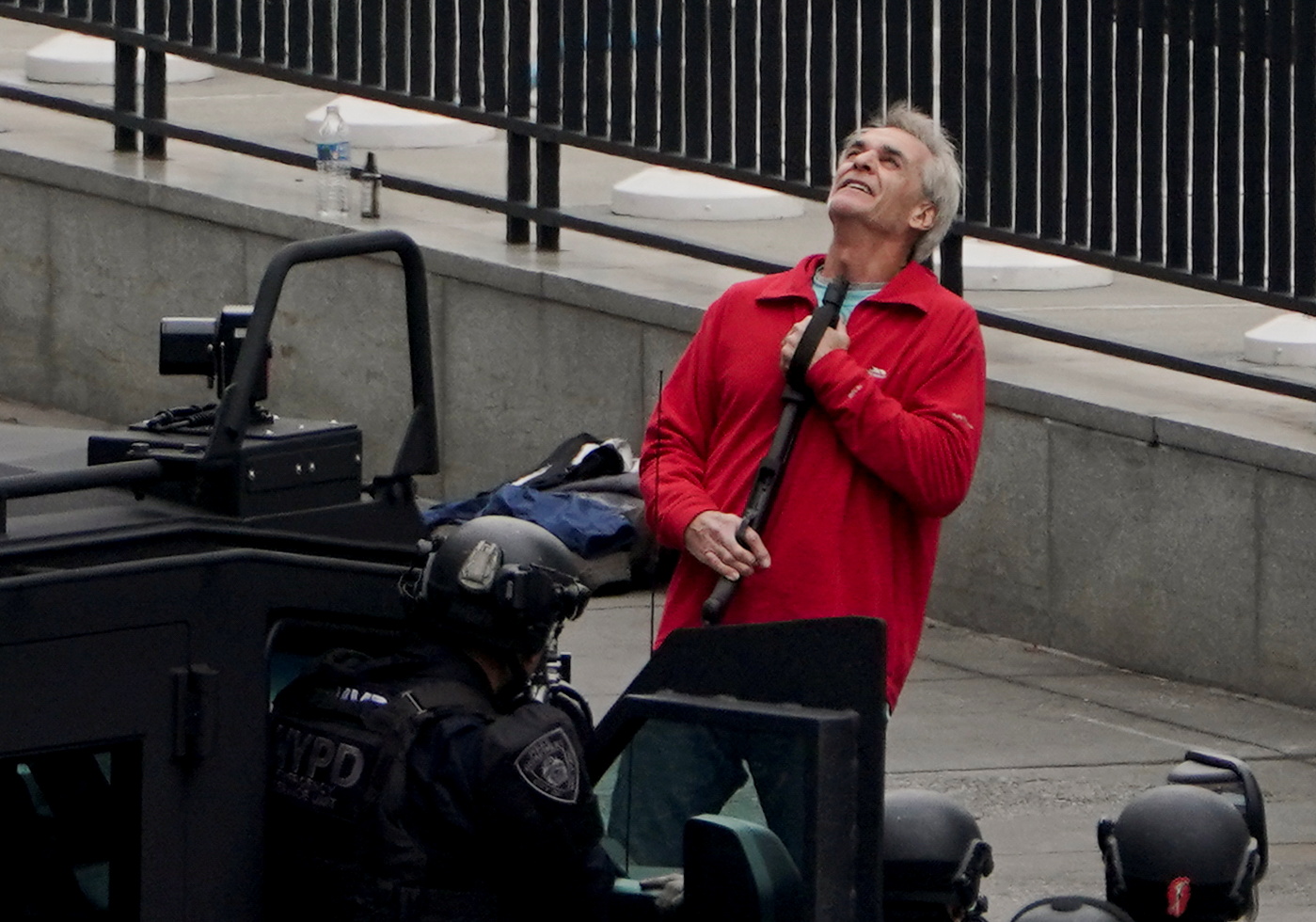 A man holds a gun under his chin as he speaks with police officers outside the United Nations Headquarters in New York City, on Dec 2, 2021.