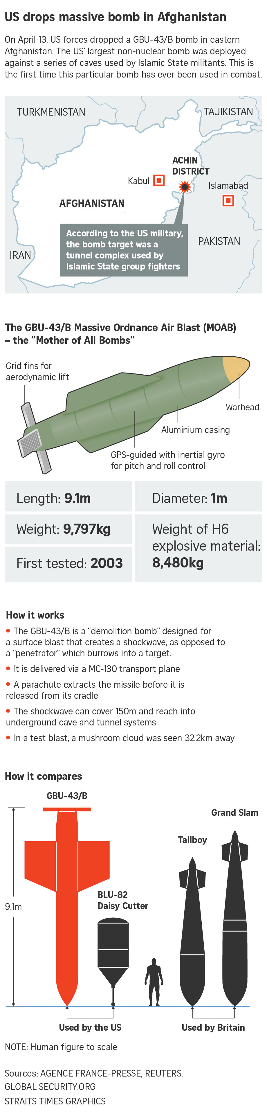 WASHINGTON (REUTERS) - The United States dropped "the mother of all bombs," the largest non-nuclear device it has ever unleashed in combat, on a network of caves and tunnels used by ISIS militants in eastern Afghanistan on Thursday (April 13), the military said.