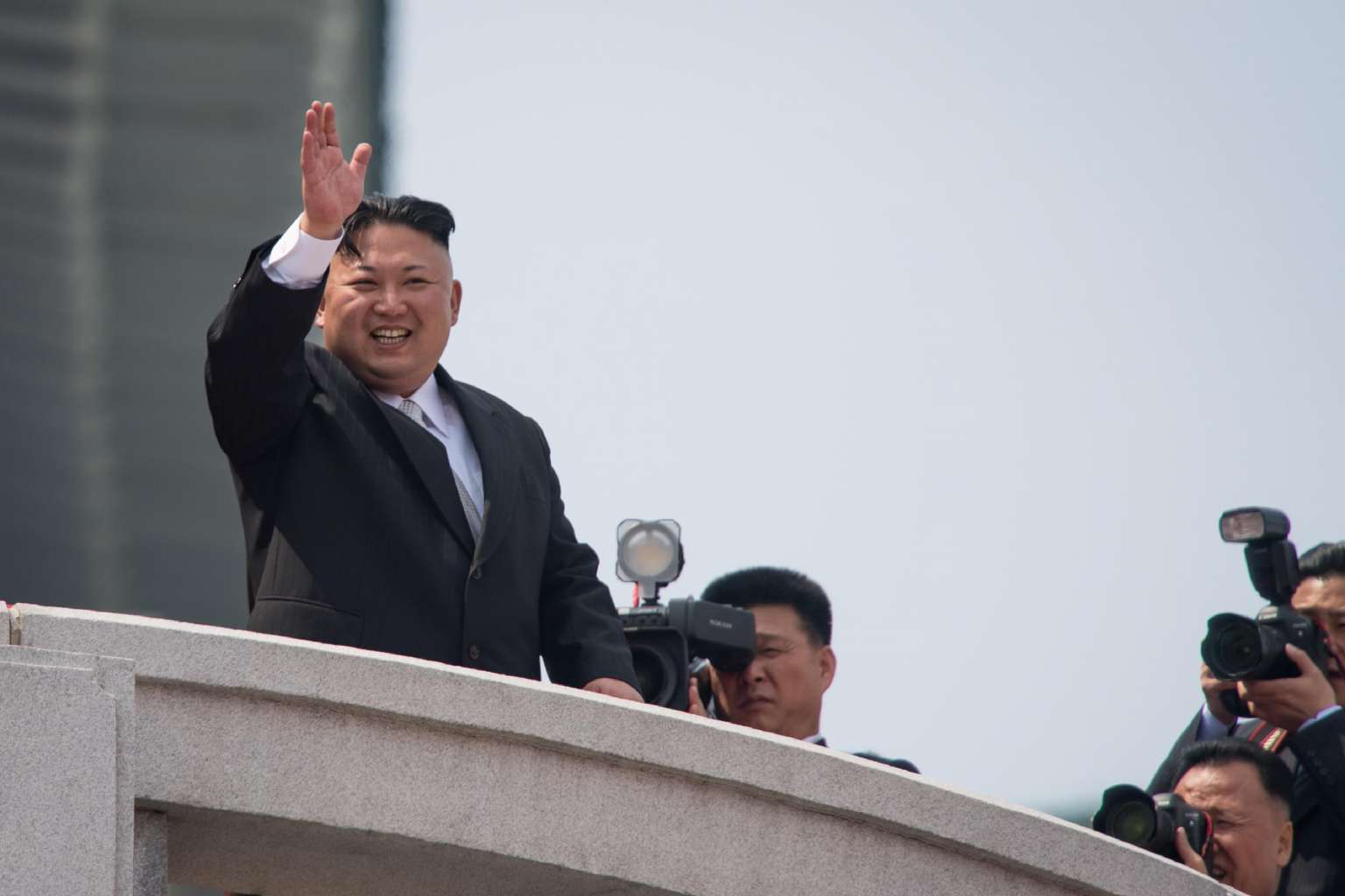 North Korean leader Kim Jong-Un waves from a balcony following a military parade.