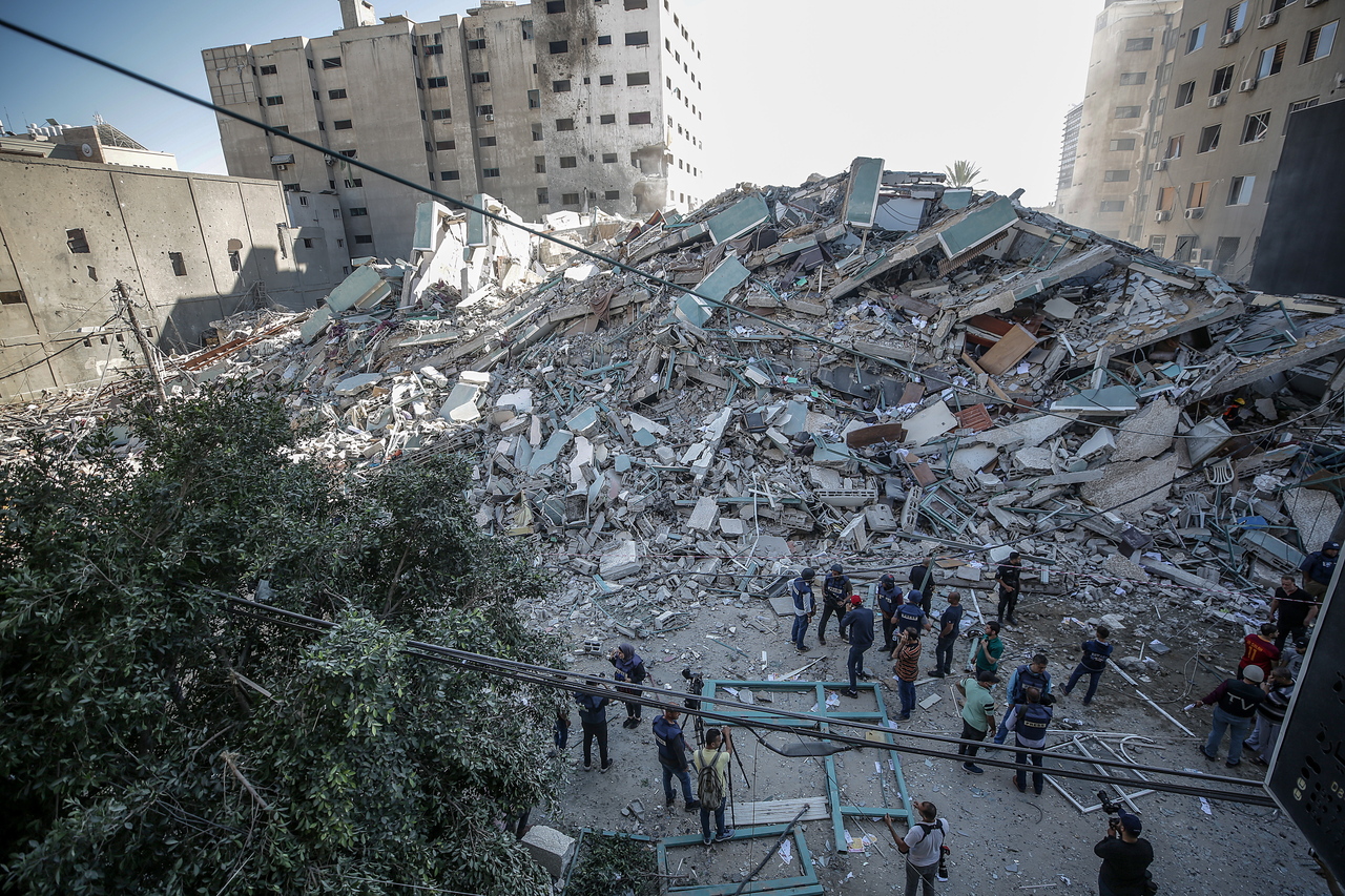 Palestinians inspect the rubbles after an Israeli air strike hit the Al-Jalaa tower in Gaza City, on May 15, 2021.